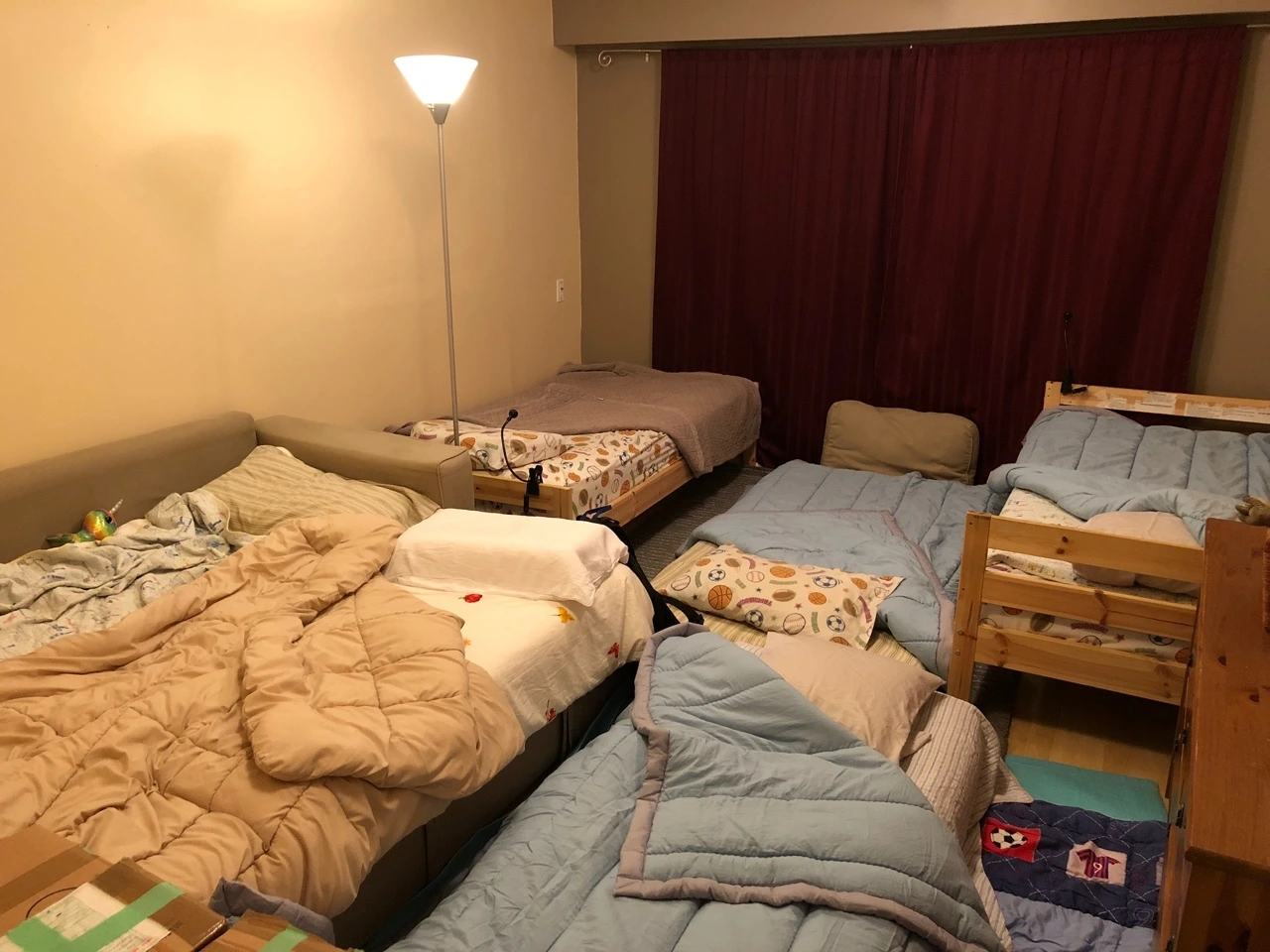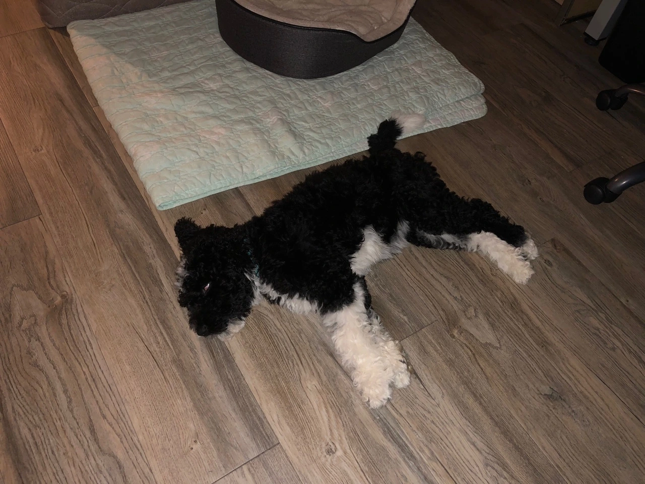 친구들이 와서 슬립오버하는 방. 시끄러움을 피해서 외딴 곳에서 쉬고 있는 강아지