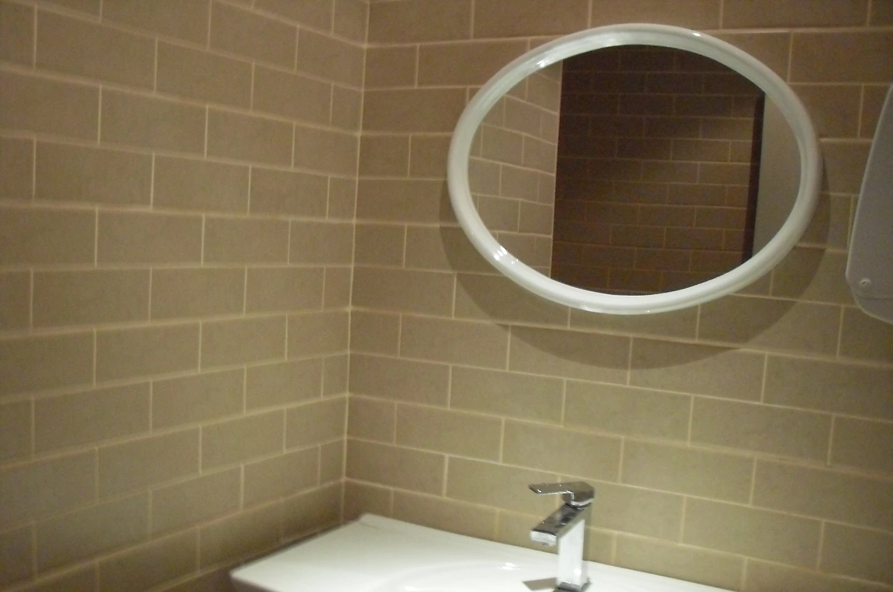 화장실 수리 후 타일 사이의 줄눈은 흰색이어야 하는데 어이없게 오렌지 색으로.
