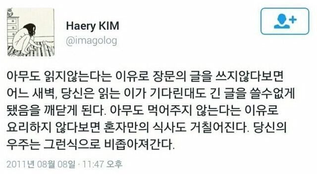 어떤 대상에 대해 사유를 그쳐버릴 때, 딱 그 정도의 생각에서만 머무를 수도 있겠다 싶어 문득 김혜리 기자님이 예전에 썼던 글이 생각나 가져와보았어요. 글도, 식사도 생활을 이루는 뿌리일진대 이들이 거칠어지지 않으려면 혼자서 모든 걸 아등바등거리기보다 누군와 함께하고 있음을 혹은 기다리고 있음을 믿어야 겠습니다.
