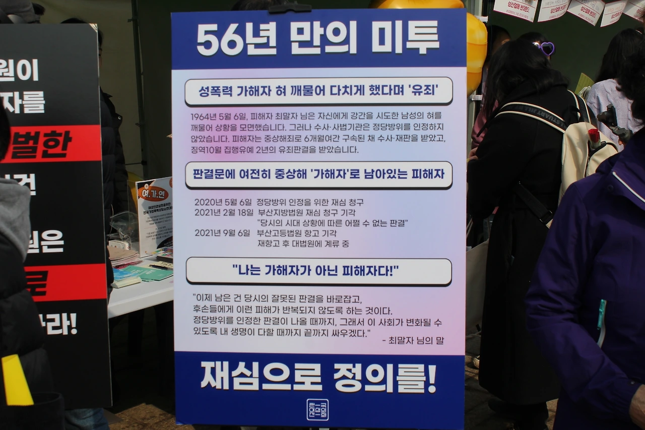 3월 4일 토요일. 서울 시청 광장에서 열린 제38회 한국여성대회 한국여성의전화 부스에서 최말자 선생님과 활동가분들을 만났다. 최말자 선생님은 56년 전 자신을 강간하려는 남성의 혀를 깨물어 상황을 모면했지만, 정당방위 인정을 받지 못해 가해자로 유죄판결을 받은 당사자이기도 하셨다. 현재 재항고 후 대법원에서 계류 중이라는 한 활동가 선생님의 설명을 듣고 마음이 맺혔다.