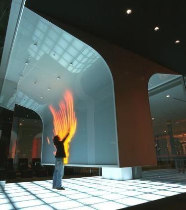 천정과 바닥의 디스플레이가 유기적으로 연동되면서 영상이 자유롭게 이동하고 변화할 수 있습니다. 이렇게 상하좌우로 움직이는 영상은 매우 생동감 있고 역동적인 분위기를 자아냅니다. 관람객들은 작품이 살아 숨 쉬는 것 같은 생명력 넘치는 에너지를 체감할 수 있습니다.