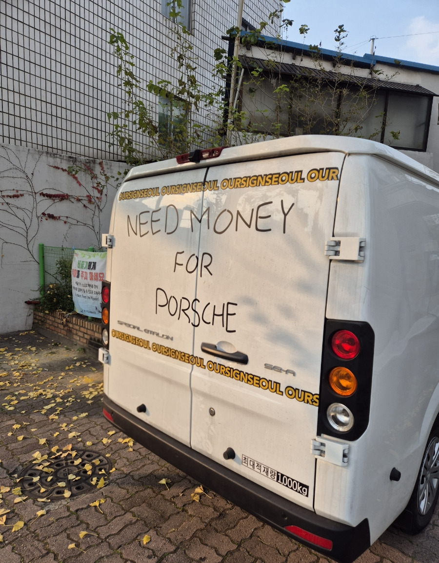 거리에 휘날리는 노랗게 물든 낙엽을 11월이 저물어가는 날에 보게 될 줄은 몰랐다. 밟히는 빛바랜 노란 낙엽을 잔잔하게 즐기며 걷는 중에 어느 자동차에 써진 재밌는 낙서가 아니라고 느껴지는 차 주인장의 솔직한 재치가 나의 시선에 물들고 있었다. 사진기를 들고 이건 꼭 찍어야겠다며 스쳐가는 거리에서 잠시 혼자 웃음을 지으며 오늘의 사진으로 담았다. 이 차의 주인은 정말, 진심으로 포르셰가 갖고 싶다는 자신의 욕망을 이 거리를 스쳐가는 모든 사람들에게 당당하게 표출하고 있었다.