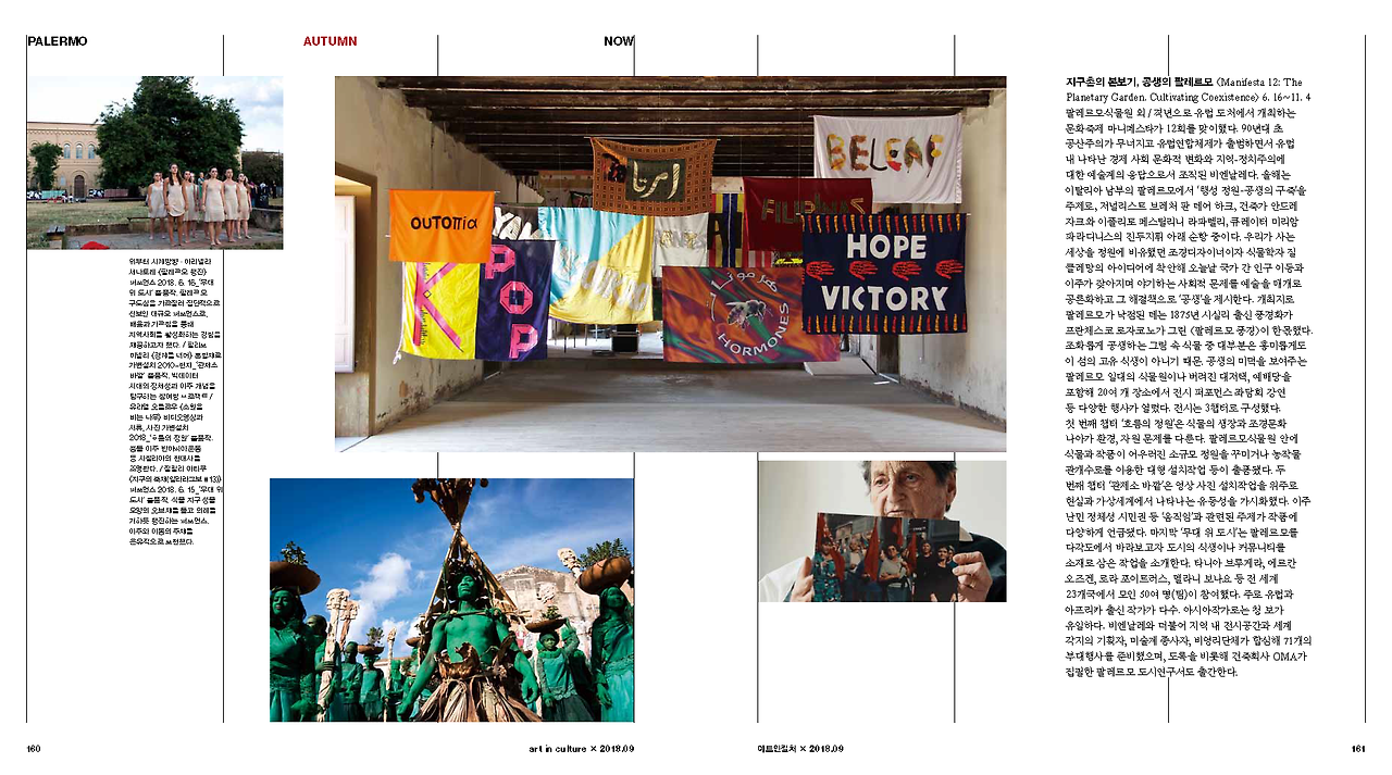 지구촌의 본보기, 공생의 팔레르모 <Manifesta 12: The Planetary Garden. Cultivating Coexistence> 6. 16~11. 4 팔레르모식물원 외 / 격년으로 유럽 도처에서 개최하는 문화축제 마니페스타가 12회를 맞이했다. 90년대 초 공산주의가 무너지고 유럽연합체제가 출범하면서 유럽 내 나타난 경제 사회 문화적 변화와 지역-정치주의에 대한 예술계의 응답으로서 조직된 비엔날레다. 올해는 이탈리아 남부의 팔레르모에서 ‘행성 정원-공생의 구축’을 주제로, 저널리스트 브레처 판 데어 하크, 건축가 안드레 자크와 이폴리토 페스틸리니 라파렐리, 큐레이터 미리암 파라디니스의 진두지휘 아래 순항 중이다. 우리가 사는 세상을 정원에 비유했던 조경 디자이너이자 식물학자 질 클레망의 아이디어에 착안해 오늘날 국가 간 인구 이동과 이주가 잦아지며 야기하는 사회적 문제를 예술을 매개로 공론화하고 그 해결책으로 ‘공생’을 제시한다. 개최지로 팔레르모가 낙점된 데는 1875년 시실리 출신 풍경화가 프란체스코 로자코노가 그린 <팔레르모 풍경>이 한몫했다. 조화롭게 공생하는 그림 속 식물 중 대부분은 흥미롭게도 이 섬의 고유 식생이 아니기 때문. 공생의 미덕을 보여주는 팔레르모 일대의 식물원이나 버려진 대저택, 예배당을 포함해 20여 개 장소에서 전시 퍼포먼스 좌담회 강연 등 다양한 행사가 열렸다. 전시는 3 챕터로 구성했다. 첫 번째 챕터 ‘흐름의 정원’은 식물의 생장과 조경문화 나아가 환경, 자원 문제를 다룬다. 팔레르모식물원 안에 식물과 작품이 어우러진 소규모 정원을 꾸미거나 농작물 관개수로를 이용한 대형 설치작업 등이 출품됐다. 두 번째 챕터 ‘관제소 바깥’은 영상 사진 설치작업을 위주로 현실과 가상세계에서 나타나는 유동성을 가시화했다. 이주 난민 정체성 시민권 등 ‘움직임’과 관련된 주제가 작품에 다양하게 언급됐다. 마지막 ‘무대 위 도시’는 팔레르모를 다각도에서 바라보고자 도시의 식생이나 커뮤니티를 소재로 삼은 작업을 소개한다. 타니아 브루게라, 에르칸 오즈겐, 로라 포이트러스, 멜라니 보나요 등 전 세계 23개국에서 모인 50여 명(팀)이 참여했다. 주로 유럽과 아프리카 출신 작가가 다수. 아시아 작가로는 청 보가 유일하다. 비엔날레와 더불어 지역 내 전시공간과 세계 각지의 기획자, 미술계 종사자, 비영리단체가 합심해 71개의 부대행사를 준비했으며, 도록을 비롯해 건축회사 OMA가 집필한 팔레르모 도시 연구서도 출간한다. / H