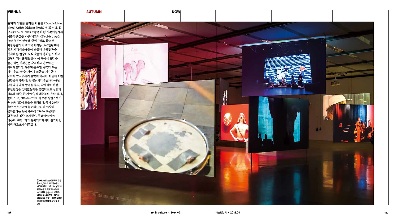 음악과 미술을 겸하는 사람들 <Double Lives: Visual Artists Making Music> 6. 23~ 11. 11 무목(The mumok) / ‘음악 하는’ 시각예술가의 이중적인 삶을 다룬 기획전 <Double Lives>. 2018 부산비엔날레 큐레이터로 위촉된 미술평론가 외르그 하이저는 1960년대부터 많은 시각예술가들이 남몰래 음악활동을 지속하는 현상이 나타났음에 흥미를 느끼고 동명의 저서를 집필했다. 이 책에서 영감을 얻은 이번 기획전은 작곡하고 연주하는 시각예술가를 다루며 순수한 음악가 또는 시각예술가라는 개념에 의문을 제기한다. 나아가 20~21세기 음악의 역사에 이들이 미친 영향을 탐구한다. 전시는 시각예술가가 아닌 그들의 음악에 방점을 두고, 작가마다 어떤 공연환경을 선택했는지를 중점적으로 살폈다. 마르셀 뒤샹, 존 케이지, 백남준부터 유타 퀘서, 알바 노토, GRAF+ZYX, 볼프강 틸먼스까지 총 46명(팀)이 모습을 드러냈다. 특히 20세기 후반 오스트리아를 기반으로 이 현상이 심화됐다는 점에 주목해 1960~80년대의 활동상을 집중 소개했다. 큐레이터 에바 바두라 트리스카와 문화기획자이자 음악가인 에덱 바르츠가 기획했다. / H