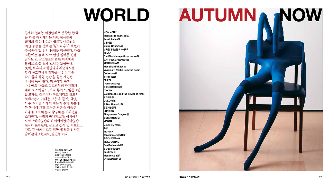 일제히 열리는 비엔날레로 분주한 한국. 올 가을 해외에서는 어떤 전시들이 화제의 중심에 설까. 글로벌 아트씬의 최신 동향을 전하는 ‘월드 나우’가 하반기 주목해야 할 전시 14개를 엄선했다. 가을 시즌에는 뉴욕 도쿄 런던 멜버른 뮌헨 밀라노 빈 암스테르담 쾰른 타이베이 팔레르모 등 11개 도시를 조명한다. 첫째, 특유의 조형원리나 작업태도를 갖춰 아트씬에서 입지를 굳건히 다진 작가들의 작업 전반을 훑는 개인전 소식이 눈에 띈다. 원로작가 브루스 나우만의 대규모 회고전부터 중견작가 에바 로스차일드, 사라 루카스, 엘름그린 & 드락셋, 젊은 작가 마르게리트 위모의 서베이 전이 기대를 모은다. 둘째, 재난, 이주, 디지털 시대의 평등과 부의 재분배 등 동시대 가장 뜨거운 담론을 미술은 어떻게 소화하는지 탐구하는 기획전을 소개한다. 유럽의 마니페스타, 아시아의 도쿄모리미술관과 타이베이현대미술관 전시가 포함됐다. 끝으로 전시 및 퍼포먼스 자료 등 아카이브를 적극 활용한 전시를 알아본다. / 한지희, 김민형 기자