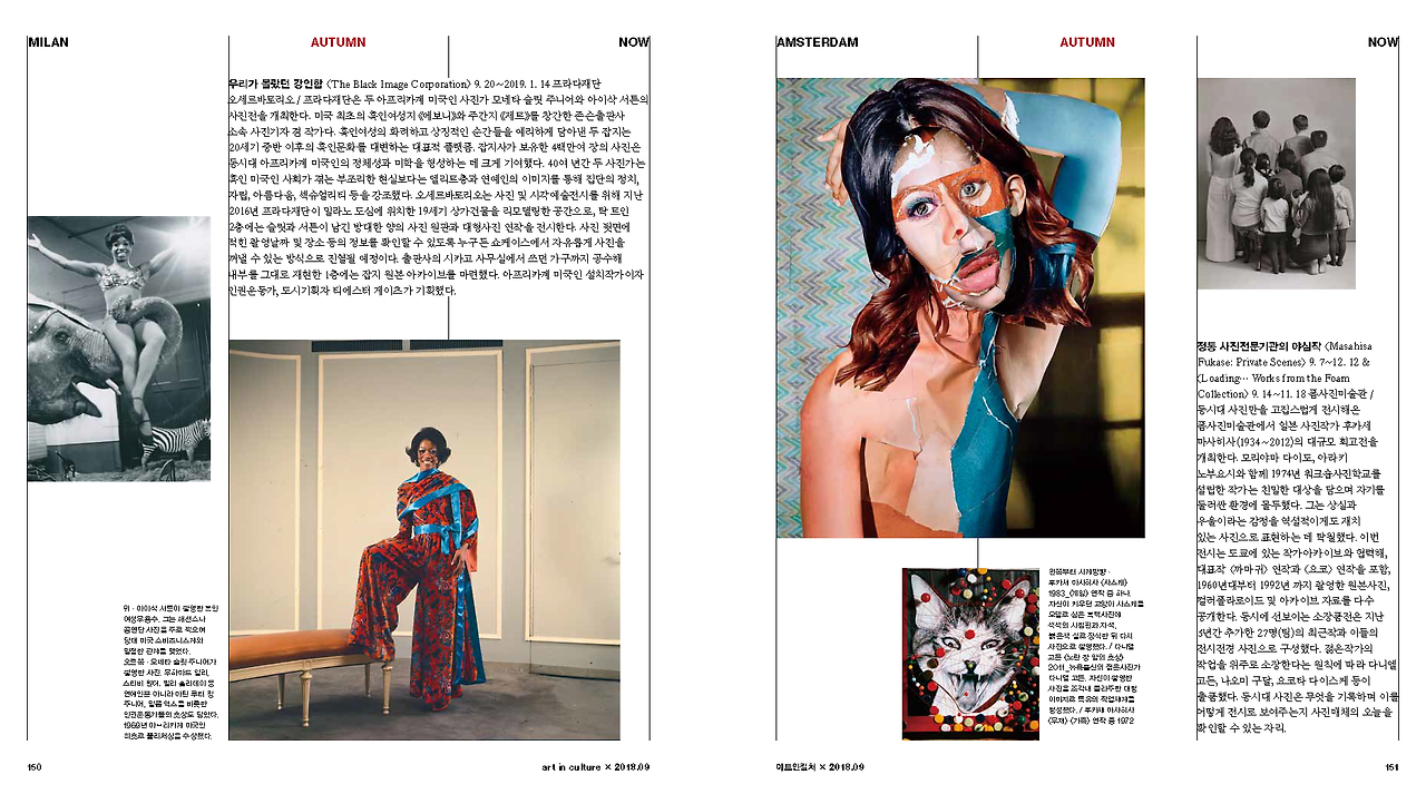 우리가 몰랐던 강인함 <The Black Image Corporation> 9. 20~2019. 1. 14 프라다재단 오세르바토리오 / 프라다재단은 두 아프리카계 미국인 사진가 모네타 슬릿 주니어와 아이삭 서튼의 사진전을 개최한다. 미국 최초의 흑인 여성지 《에보니》와 주간지 《제트》를 창간한 존슨출판사 소속 사진기자 겸 작가다. 흑인 여성의 화려하고 상징적인 순간들을 예리하게 담아낸 두 잡지는 20세기 중반 이후의 흑인 문화를 대변하는 대표적 플랫폼. 잡지사가 보유한 4백만여 장의 사진은 동시대 아프리카계 미국인의 정체성과 미학을 형성하는 데 크게 기여했다. 40여 년간 두 사진가는 흑인 미국인 사회가 겪는 부조리한 현실보다는 엘리트층과 연예인의 이미지를 통해 집단의 정치, 자립, 아름다움, 섹슈얼리티 등을 강조했다. 오세르바토리오는 사진 및 시각예술 전시를 위해 지난 2016년 프라다재단이 밀라노 도심에 위치한 19세기 상가건물을 리모델링한 공간으로, 탁 트인 2층에는 슬릿과 서튼이 남긴 방대한 양의 사진 원판과 대형 사진 연작을 전시한다. 사진 뒷면에 적힌 촬영날짜 및 장소 등의 정보를 확인할 수 있도록 누구든 쇼케이스에서 자유롭게 사진을 꺼낼 수 있는 방식으로 진열될 예정이다. 출판사의 시카고 사무실에서 쓰던 가구까지 공수해 내부를 그대로 재현한 1층에는 잡지 원본 아카이브를 마련했다. 아프리카계 미국인 설치작가이자 인권운동가, 도시기획자 티에스터 게이츠가 기획했다. / 김민형 기자(이하 K)