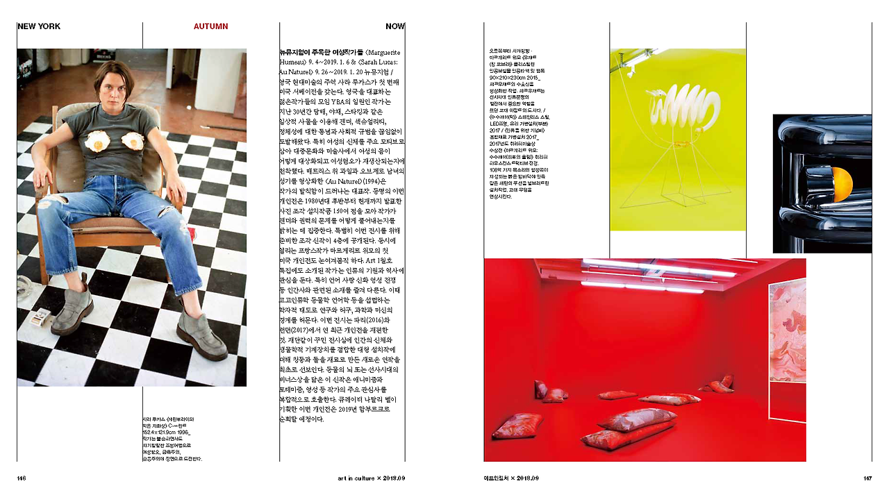 뉴뮤지엄이 주목한 여성작가들 <Marguerite Humeau> 9. 4~2019. 1. 6 & <Sarah Lucas: Au Naturel> 9. 26~2019. 1. 20 뉴뮤지엄 / 영국 현대미술의 주역 사라 루카스가 첫 번째 미국 서베이 전을 갖는다. 영국을 대표하는 젊은 작가들의 모임 YBA의 일원인 작가는 지난 30년간 담배, 야채, 스타킹과 같은 일상적 사물을 이용해 젠더, 섹슈얼리티, 정체성에 대한 통념과 사회적 규범을 끊임없이 도발해왔다. 특히 여성의 신체를 주요 모티브로 삼아 대중문화와 미술사에서 여성의 몸이 어떻게 대상화되고 여성 혐오가 재생산되는지에 천착했다. 매트리스 위 과일과 오브제로 남녀의 성기를 형상화한 <Au Naturel>(1994)은 작가의 발칙함이 드러나는 대표작. 동명의 이번 개인전은 1980년대 후반부터 현재까지 발표한 사진 조각 설치작품 150여 점을 모아 작가가 젠더와 권력의 문제를 어떻게 풀어내는지를 밝히는 데 집중한다. 특별히 이번 전시를 위해 준비한 조각 신작이 4층에 공개된다. 동시에 열리는 프랑스 작가 마르게리트 위모의 첫 미국 개인전도 눈여겨봄직 하다. Art 1월호 특집에도 소개된 작가는 인류의 기원과 역사에 관심을 둔다. 특히 언어 사랑 신화 영성 전쟁 등 인간사와 관련된 소재를 즐겨 다룬다. 이때 고고인류학 동물학 언어학 등을 섭렵하는 학자적 태도로 연구와 허구, 과학과 미신의 경계를 허문다. 이번 전시는 파리(2016)와 런던(2017)에서 연 최근 개인전을 재편한 것. 재단같이 꾸민 전시실에 인간의 신체와 생물학적 기계장치를 결합한 대형 설치작에 더해 청동과 돌을 재료로 만든 새로운 연작을 최초로 선보인다. 동물의 뇌 또는 선사시대의 비너스상을 닮은 이 신작은 애니미즘과 토테미즘, 영성 등 작가의 주요 관심사를 복합적으로 호출한다. 큐레이터 나탈리 벨이 기획한 이번 개인전은 2019년 함부르크로 순회할 예정이다. / 한지희 기자(이하 H)