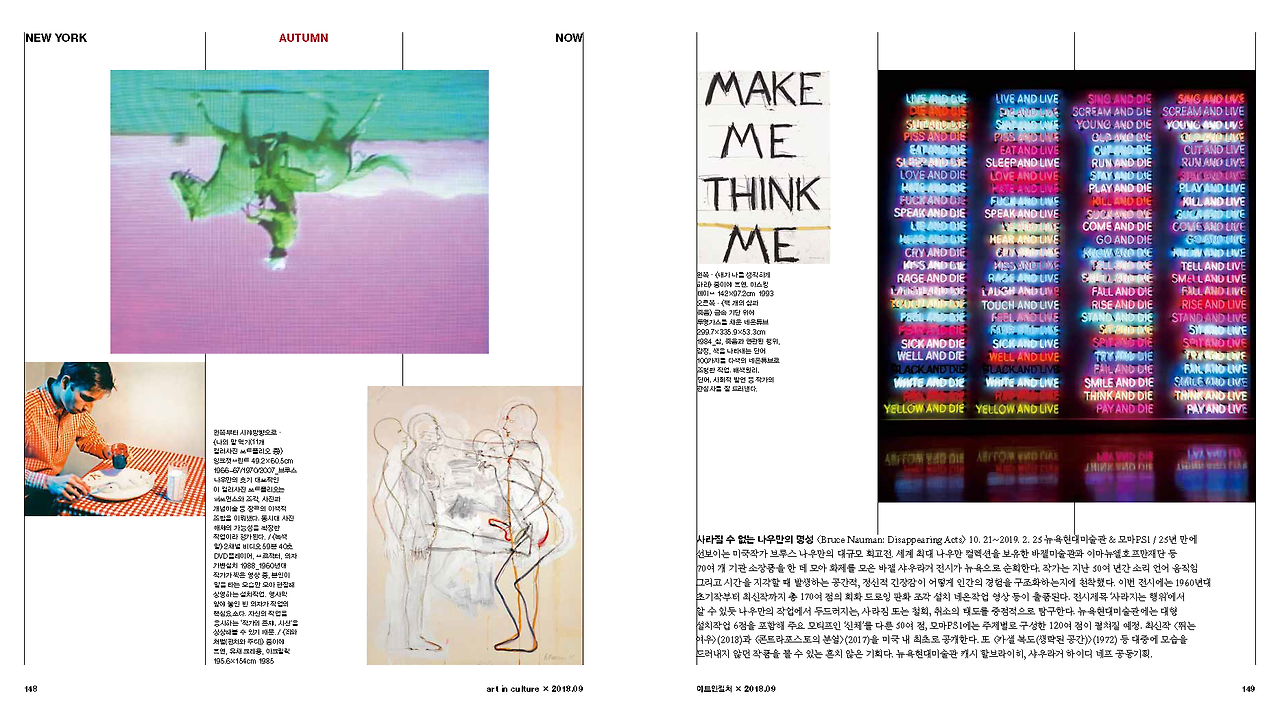 사라질 수 없는 나우만의 명성 <Bruce Nauman: Disappearing Acts> 10. 21~2019. 2. 25 뉴욕현대미술관 & 모마PS1 / 25년 만에 선보이는 미국 작가 브루스 나우만의 대규모 회고전. 세계 최대 나우만 컬렉션을 보유한 바젤미술관과 이마뉴엘호프만재단 등 70여 개 기관 소장품을 한 데 모아 화제를 모은 바젤 샤우라거 전시가 뉴욕으로 순회한다. 작가는 지난 50여 년간 소리 언어 움직임 그리고 시간을 지각할 때 발생하는 공간적, 정신적 긴장감이 어떻게 인간의 경험을 구조화하는지에 천착했다. 이번 전시에는 1960년대 초기작부터 최신작까지 총 170여 점의 회화 드로잉 판화 조각 설치 네온 작업 영상 등이 출품된다. 전시 제목 ‘사라지는 행위’에서 알 수 있듯 나우만의 작업에서 두드러지는, 사라짐 또는 철회, 취소의 태도를 중점적으로 탐구한다. 뉴욕현대미술관에는 대형 설치작업 6점을 포함해 주요 모티프인 ‘신체’를 다룬 50여 점, 모마PS1에는 주제별로 구성한 120여 점이 펼쳐질 예정. 최신작 <뛰는 여우>(2018)과 <콘트라포스토의 분열>(2017)을 미국 내 최초로 공개한다. 또 <카셀 복도(생략된 공간)>(1972) 등 대중에 모습을 드러내지 않던 작품을 볼 수 있는 흔치 않은 기회다. 뉴욕현대미술관 캐시 할브라이히, 샤우라거 하이디 네프 공동기획. / H