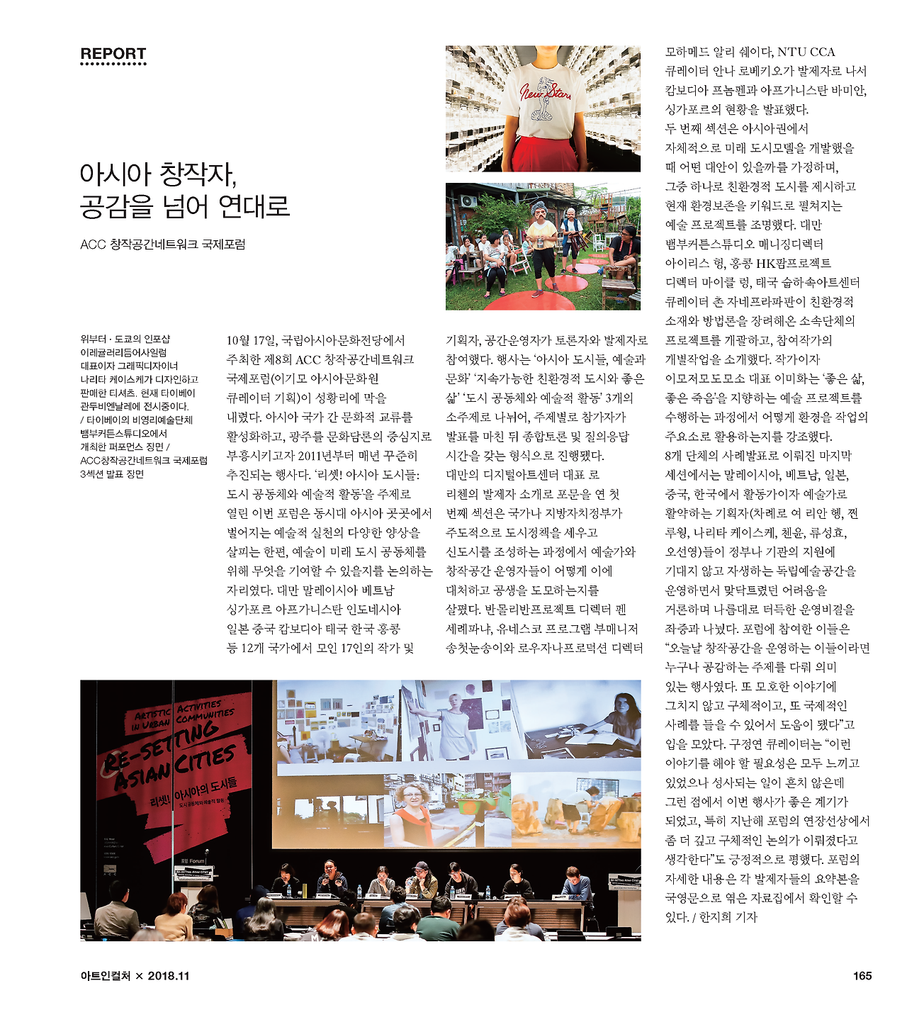 10월 17일, 국립아시아문화전당에서 주최한 제8회 ACC 창작공간네트워크 국제포럼(이기모 아시아문화원 큐레이터 기획)이 성황리에 막을 내렸다. 아시아 국가 간 문화적 교류를 활성화하고, 광주를 문화담론의 중심지로 부흥시키고자 2011년부터 매년 꾸준히 추진되는 행사다. ‘리셋! 아시아 도시들: 도시 공동체와 예술적 활동’을 주제로 열린 이번 포럼은 동시대 아시아 곳곳에서 벌어지는 예술적 실천의 다양한 양상을 살피는 한편, 예술이 미래 도시 공동체를 위해 무엇을 기여할 수 있을지를 논의하는 자리였다. 대만 말레이시아 베트남 싱가포르 아프가니스탄 인도네시아 일본 중국 캄보디아 태국 한국 홍콩 등 12개 국가에서 모인 17인의 작가 및 기획자, 공간 운영자가 토론자와 발제자로 참여했다. 행사는 ‘아시아 도시들, 예술과 문화’ ‘지속 가능한 친환경적 도시와 좋은 삶’ ‘도시 공동체와 예술적 활동’ 3개의 소주제로 나뉘어, 주제별로 참가자가 발표를 마친 뒤 종합토론 및 질의응답 시간을 갖는 형식으로 진행됐다.