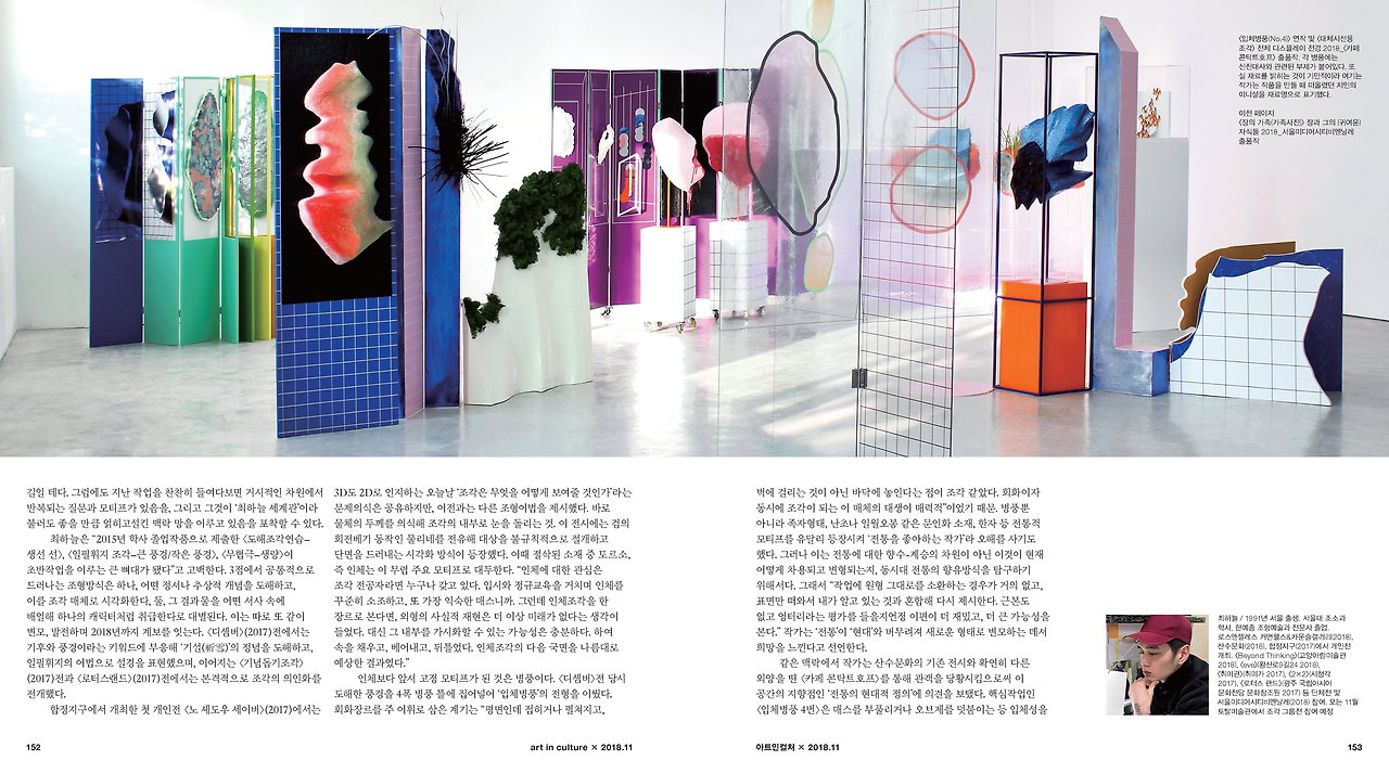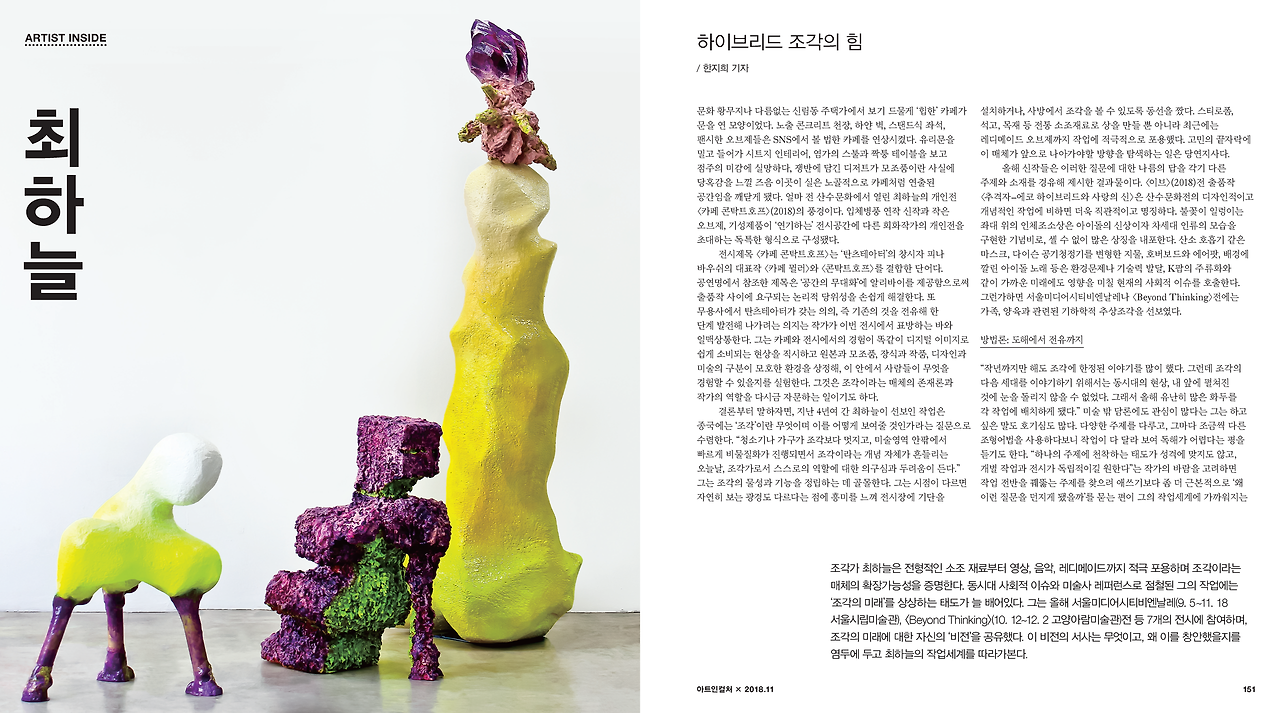 조각가 최하늘은 전형적인 소조 재료부터 영상, 음악, 레디메이드까지 적극 포용하며 조각이라는 매체의 확장 가능성을 증명한다. 동시대 사회적 이슈와 미술사 레퍼런스로 점철된 그의 작업에는 ‘조각의 미래’를 상상하는 태도가 늘 배어있다. 그는 올해 서울미디어시티비엔날레(2018. 9. 5~11. 18 서울시립미술관), <Beyond Thinking>(2018. 10. 12~12. 2 고양아람미술관)전 등 7개의 전시에 참여하며, 조각의 미래에 대한 자신의 ‘비전’을 공유했다. 이 비전의 서사는 무엇이고, 왜 이를 창안했을지를 염두에 두고 최하늘의 작업세계를 따라가 본다. / 한지희 기자