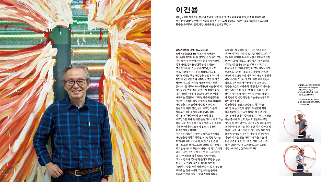노당익장(老當益壯). 원로작가 이건용의 2018년을 이보다 더 잘 설명할 수 있을까. 그는 지난 50여 년간 한국 전위예술을 이끌어왔다. 신체, 공간, 관계를 실험하는 행위미술이 그의 전매특허. 그는 올해 시드니, 베이징, 서울, 대전에서 전시를 개최했다. 시드니, 베이징에서는 처음 개인전을 열었다. 2017년 런던 주영한국문화원 기획전을 포함해 최근 해외에서 그의 ‘파격’을 재조명하기 시작한 것이다. 1월 시드니 4A아시아현대미술센터에서 열린 <동일 면적: 이건용>전에서 이벤트 현장 아카이브와 <달팽이 걸음>을 포함한 7개의 대표작을 실연했다. 2016년 광주비엔날레를 방문한 아트센터 관장이 당시 열린 갤러리현대 개인전을 보고 전시를 제안했다. 호주의 젊은 작가 3인이 설치, 영상, 퍼포먼스 등의 매체로 이건용을 재해석한 작업도 함께 전시됐다. “개막식에서 한 작가와 협동 퍼포먼스를 했다. 전시실 문을 사이에 두고 그는 발로, 나는 반대쪽에서 팔을 넘겨 색을 칠했다. 이날 300명가량 모였는데 알고 보니 전부 미술관계자들이었다.”