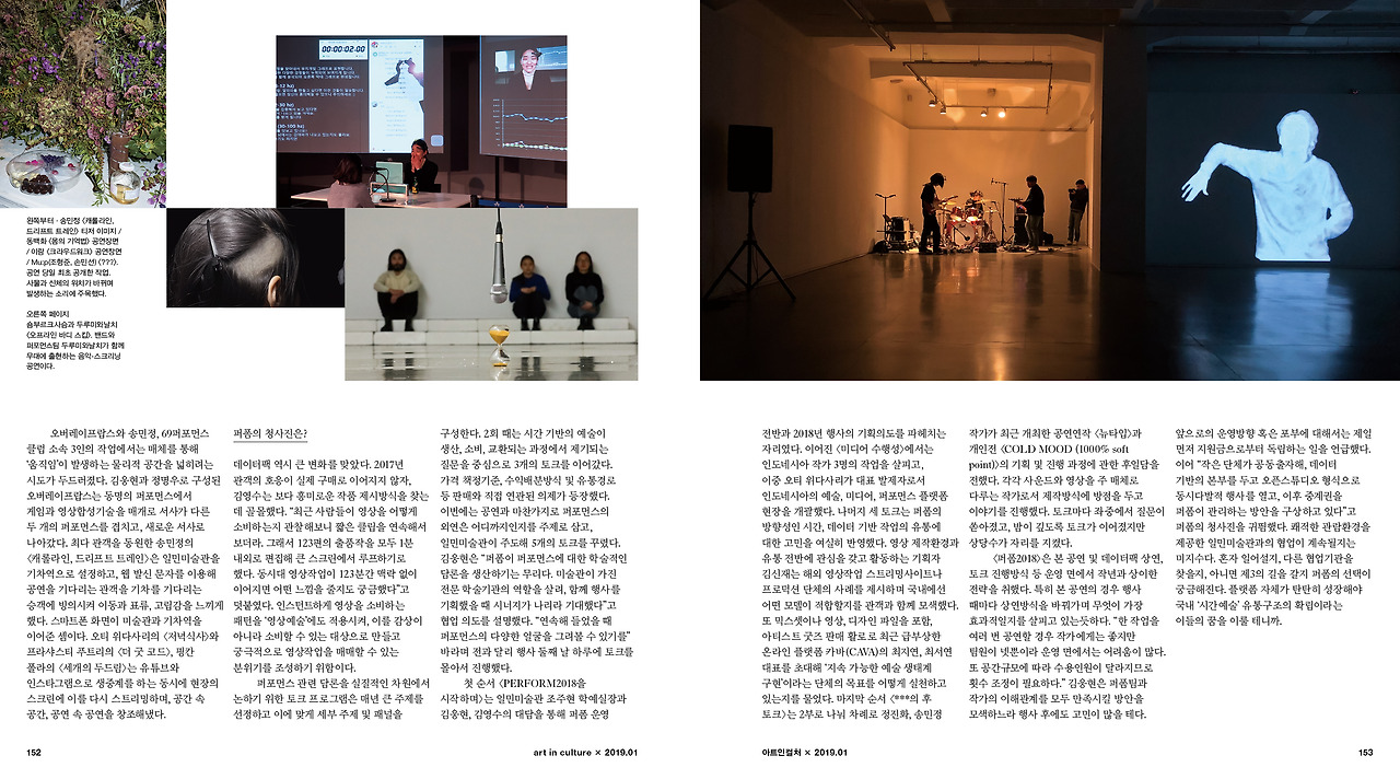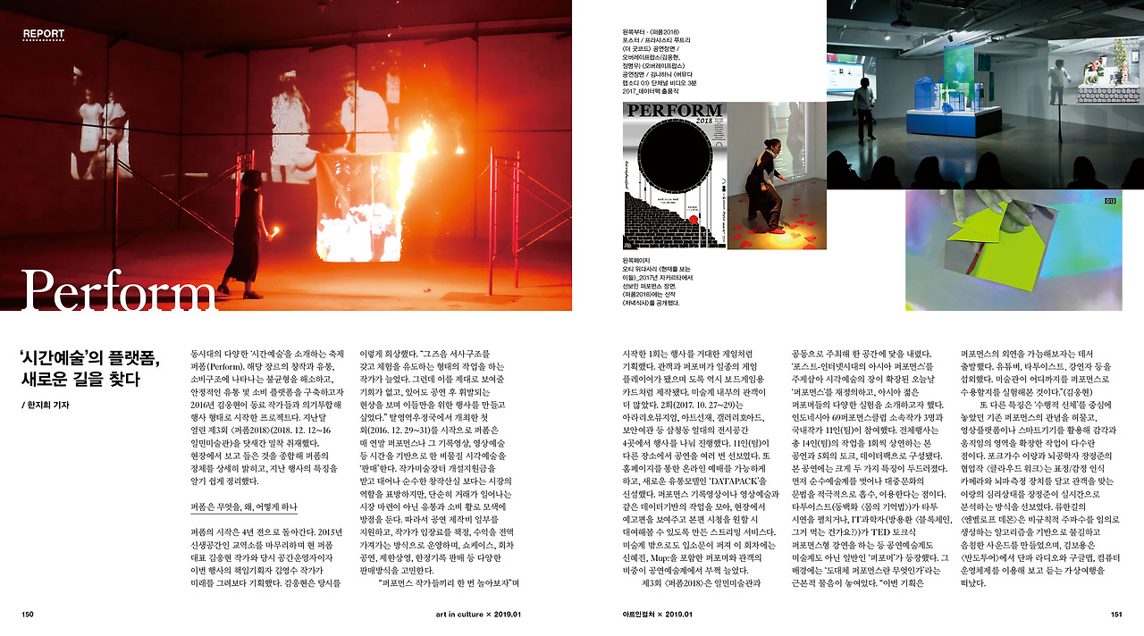 동시대의 다양한 ‘시간예술’을 소개하는 축제 퍼폼(Perform). 해당 장르의 창작과 유통, 소비구조에 나타나는 불균형을 해소하고, 안정적인 유통 및 소비 플랫폼을 구축하고자 2016년 김웅현이 동료 작가들과 의기투합해 행사 형태로 시작한 프로젝트다. 지난달 열린 제3회 <퍼폼2018>(2018. 12. 12~16 일민미술관)을 닷새간 밀착 취재했다. 현장에서 보고 들은 것을 종합해 퍼폼의 정체를 상세히 밝히고, 지난 행사의 특징을 알기 쉽게 정리했다. / 한지희 기자