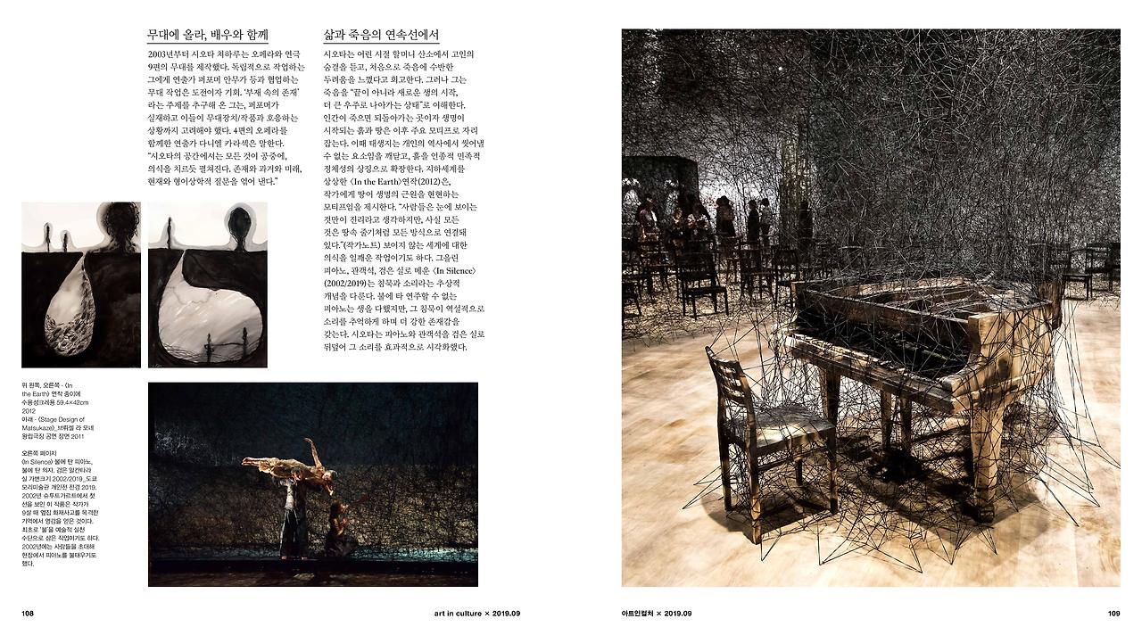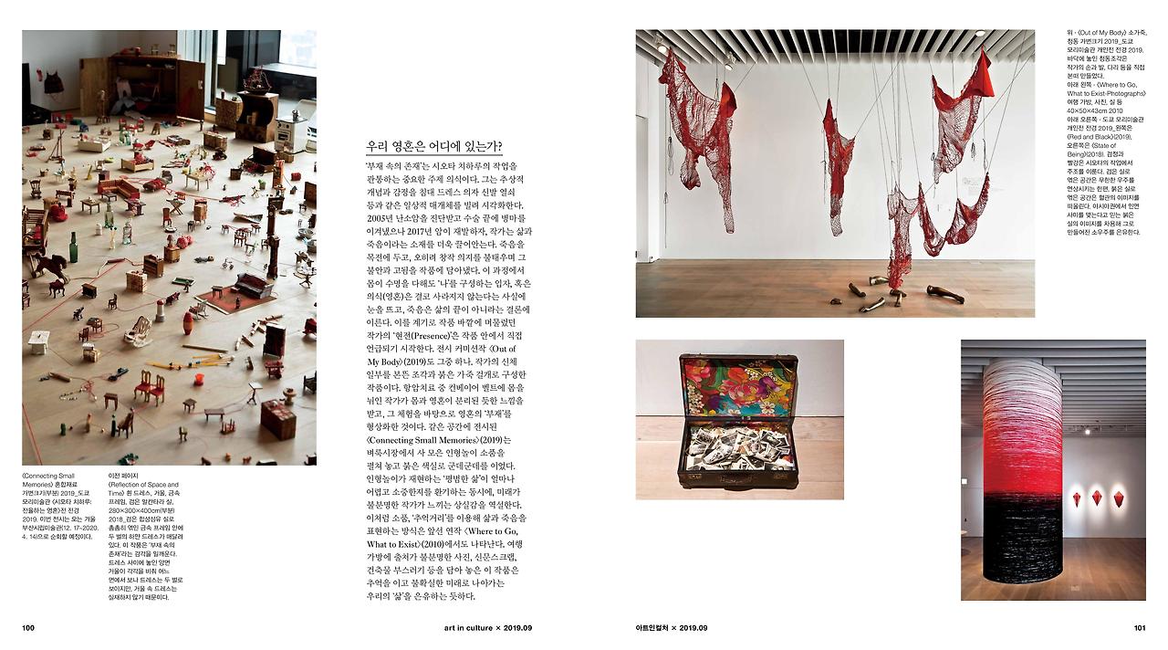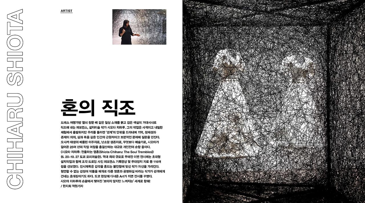 드레스 여행가방 열쇠 창문 배 같은 일상 소재를 붉고 검은 색실의 거대 서사로 직조해 내는 퍼포먼스, 설치미술 작가 시오타 치하루. 그의 작업은 사적이고 내밀한 체험에서 출발하지만 우리를 둘러싼 ‘경계’의 안팎을 드러내며 기억, 정체성과 존재의 의의, 삶과 죽음 같은 인간의 근원적이고 보편적인 문제에 질문을 던진다. 오사카 태생의 베를린 이주자로, 난소암 생존자로, 무엇보다 예술가로, 시오타가 걸어온 25여 년의 작업 여정을 총 결산하는 대규모 개인전이 순항 중이다. <시오타 치하루: 전율하는 영혼(Shiota Chiharu: The Soul Trembles)>(2019. 6. 20~10. 27 도쿄 모리미술관 / 2020년 현재 평창동 가나아트센터에서 전시 중 8.23까지). 역대 최대 규모로 꾸려진 이번 전시에는 초대형 설치작업과 함께 조각 드로잉 사진 퍼포먼스 기록영상 및 무대장치 자료 등 116여 점을 선보였다. 전시 제목은 감각을 흔드는 불안함에 맞선 작가 자신을 가리킨다. 형언할 수 없는 감정이 작품을 매개로 다른 영혼과 공명하길 바라는 작가가 관객에게 건네는 초대장이기도 하다. 도쿄 현장에 다녀온 Art가 지면 전시를 꾸몄다. 시오타 치하루의 손끝에서 맺어진 ‘보이지 않지만 느껴지는’ 세계로 항해! / 한지희 객원기자