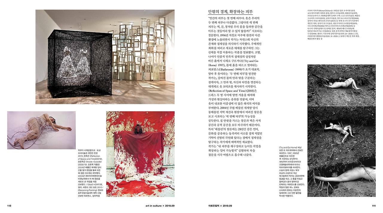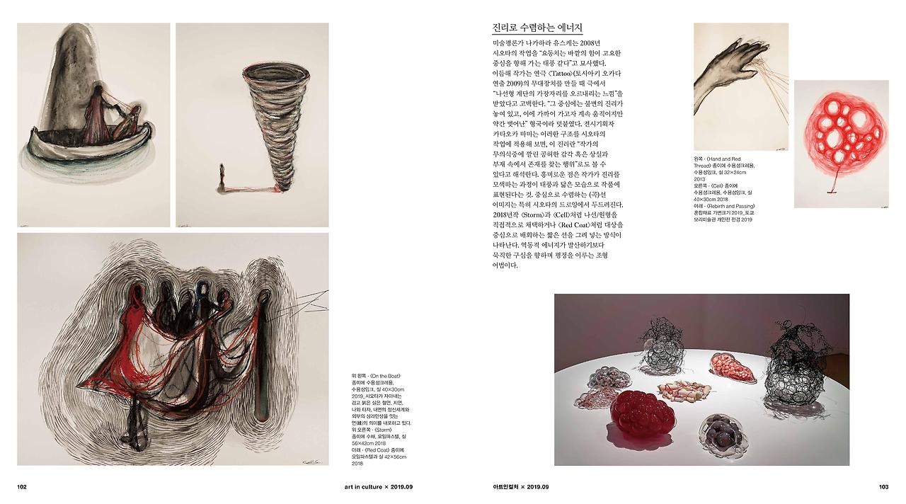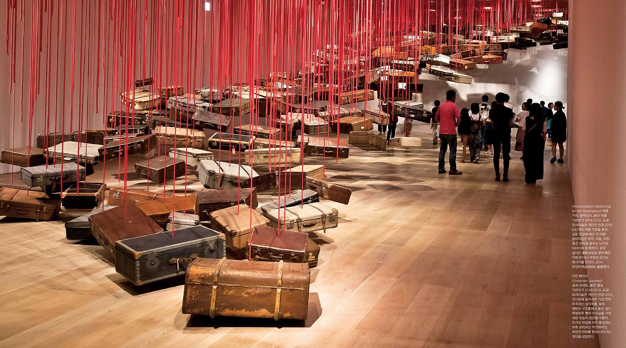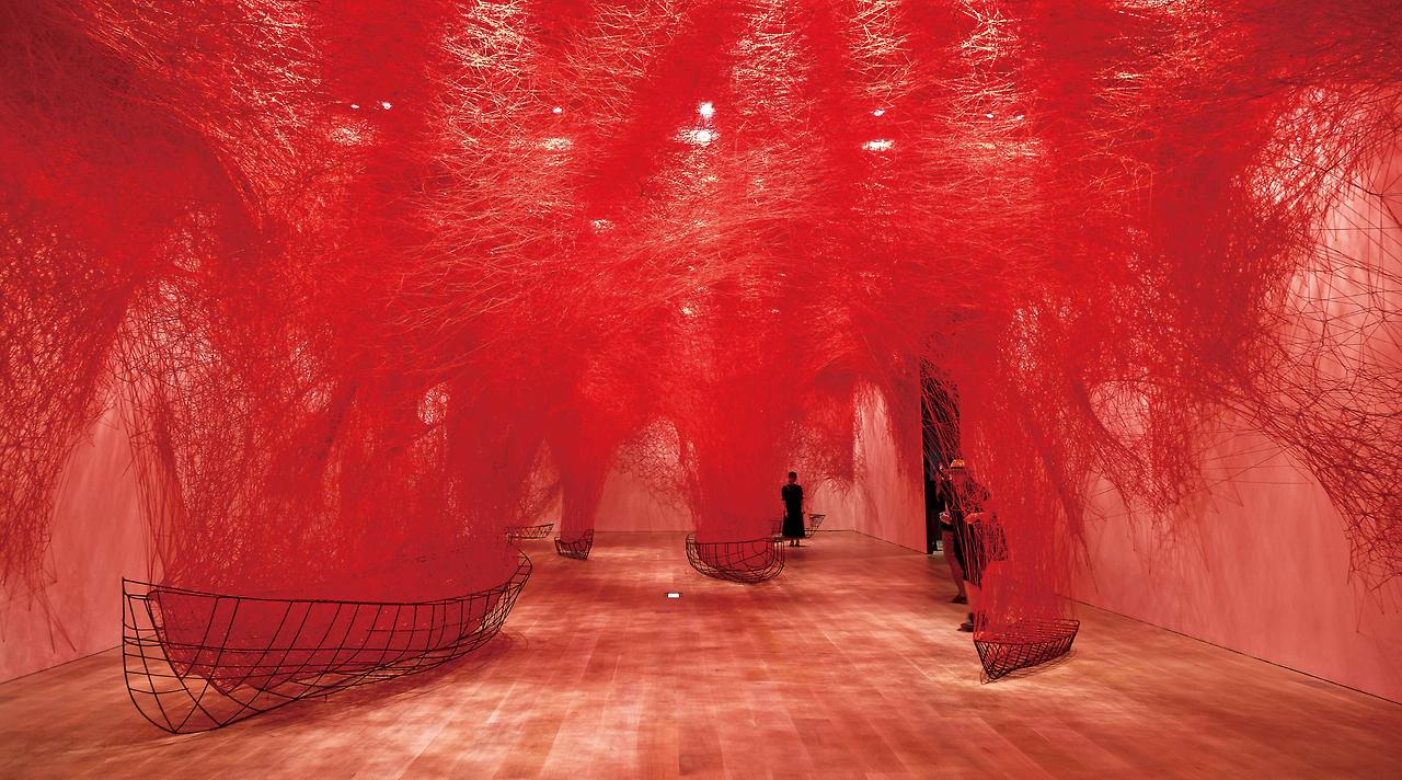 드레스 여행가방 열쇠 창문 배 같은 일상 소재를 붉고 검은 색실의 거대 서사로 직조해 내는 퍼포먼스, 설치미술 작가 시오타 치하루. 그의 작업은 사적이고 내밀한 체험에서 출발하지만 우리를 둘러싼 ‘경계’의 안팎을 드러내며 기억, 정체성과 존재의 의의, 삶과 죽음 같은 인간의 근원적이고 보편적인 문제에 질문을 던진다. 오사카 태생의 베를린 이주자로, 난소암 생존자로, 무엇보다 예술가로, 시오타가 걸어온 25여 년의 작업 여정을 총 결산하는 대규모 개인전이 순항 중이다. <시오타 치하루: 전율하는 영혼(Shiota Chiharu: The Soul Trembles)>(2019. 6. 20~10. 27 도쿄 모리미술관 / 2020년 현재 평창동 가나아트센터에서 전시 중 8.23까지). 역대 최대 규모로 꾸려진 이번 전시에는 초대형 설치작업과 함께 조각 드로잉 사진 퍼포먼스 기록영상 및 무대장치 자료 등 116여 점을 선보였다. 전시 제목은 감각을 흔드는 불안함에 맞선 작가 자신을 가리킨다. 형언할 수 없는 감정이 작품을 매개로 다른 영혼과 공명하길 바라는 작가가 관객에게 건네는 초대장이기도 하다. 도쿄 현장에 다녀온 Art가 지면 전시를 꾸몄다. 시오타 치하루의 손끝에서 맺어진 ‘보이지 않지만 느껴지는’ 세계로 항해! / 한지희 객원기자