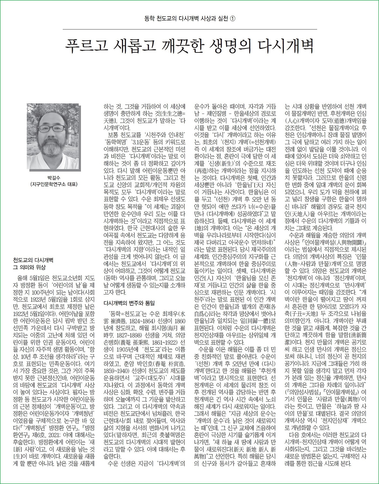[필자 주] 이 글은 한국종교인평화회의(KCRP) 기관지인 <종교와 평화> 제166호(3월 12일자) 17면에 게재된 글입니다. 천도교의 다시개벽, 그 의미와 위상 올해 ...