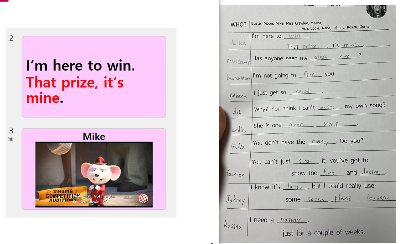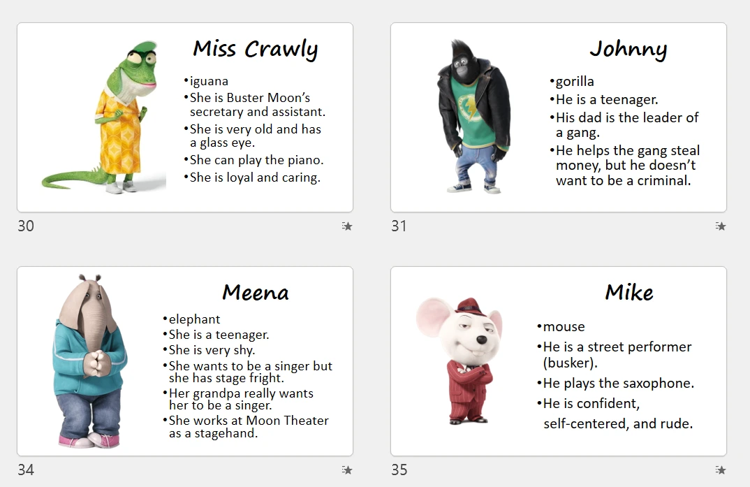 영화 'Sing'은 음악을 향한 열정으로 뭉친 개성 있는 캐릭터들이 펼치는 꿈의 무대를 그린다. 이번 수업은 인물의 대사와 행동을 통해 성격을 파악하는 활동을 중심으로 계획했다.