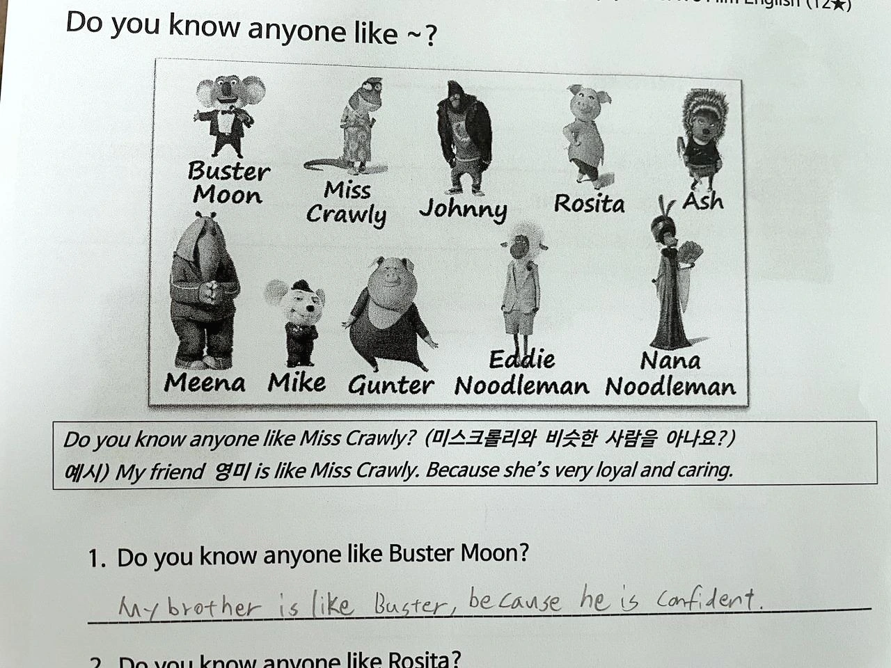 인물의 캐릭터와 성격에 관한 표현을 내 주변 사람들과 연결 지어 짧은 글쓰기 활동을 했다. 물론 이는 언어를 내 실제 생활과 연결시켜 소통과 상상의 매개로 사용하기 위함이다. 하지만 활동 중 우려스러운 지점이 발견됐다. 일단 rude 나 lazy처럼 다소 부정적인 의미를 가진 단어를 주변인 특히 반 친구들과 연결하는 경우다. 친구 사이의 관계나 맥락에 따라 한바탕 웃고 넘어갈 수도 있지만 상처 받는 학생이 생길 수도 있으므로 특히 주의를 줬다. 더 근본적으로는 짧은 어휘 몇 개로 한 사람을 정의하게 하는 활동에 내재한 근본적인 위험성이다. 결국 나는 학생들과 잠시 대화 시간을 가졌다.