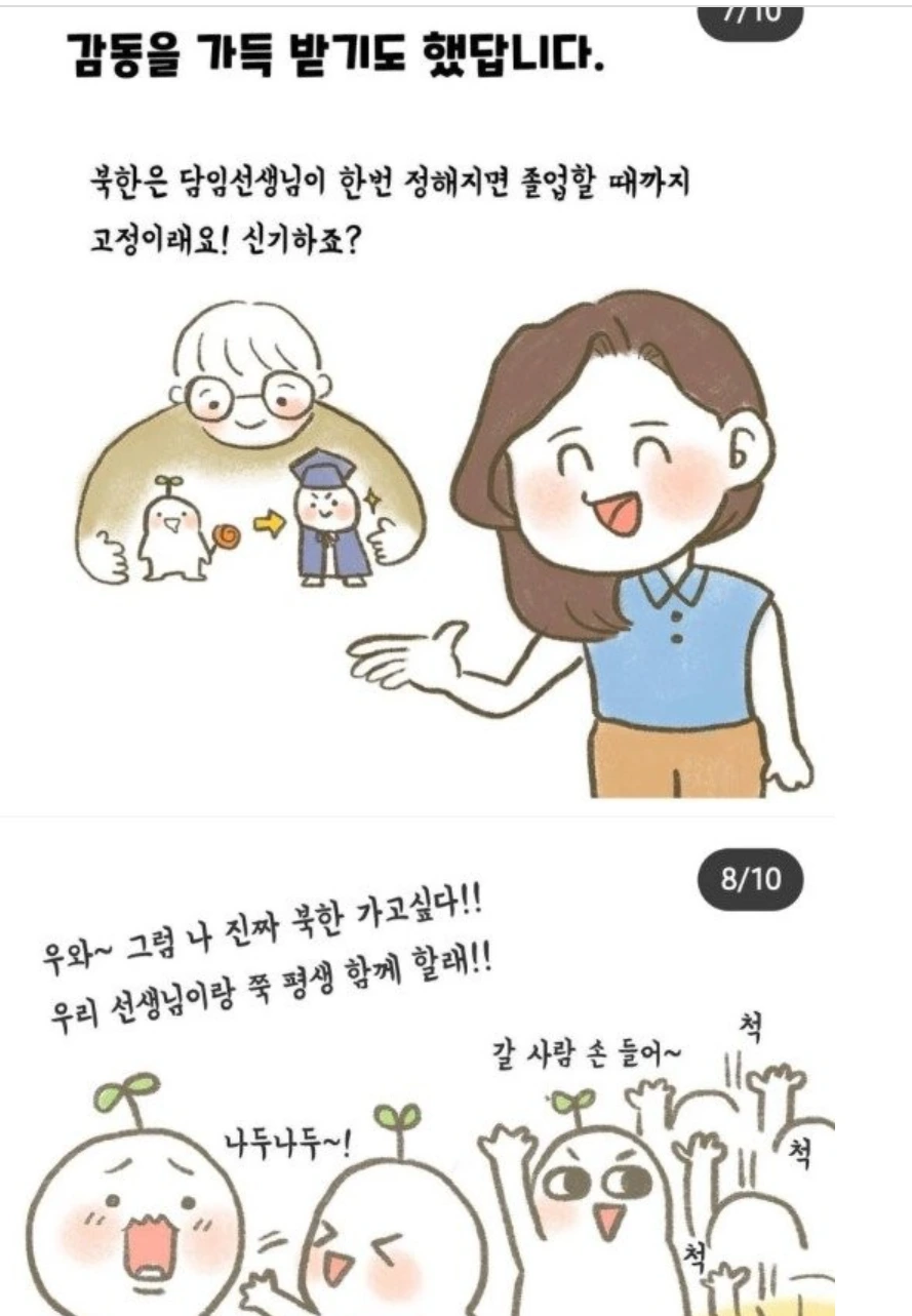 얼마 전 경기도교육청의 웹툰이 북한 찬양 논란에 휩싸였다. 신청인이 사연을 보내면 그려주는 코너인데 한 초등교사가 전한 2학년 수업 시간 모습이 문제가 됐다. 북한의 소풍과 운동회 장면을 보고 아이들이 ‘북한 가고 싶다!’라는 말을 한 장면 등이 그려졌기 때문이다. 교육청은 즉각 사과 후 게시물을 삭제했지만 징계요구, 국민청원, 교원단체 성명이 이어졌다. 많은 초등교사들은 황당했다. 저학년 통합과목에서 ‘통일’ 주제 단원 ‘북한의 생활’ 관련 수업을 하면 어린이들은 비슷한 반응을 보인다. 북한은 어린이날이 두 번이라는 교과서 내용을 보고 ‘와 북한 좋다!’라고 말한다.