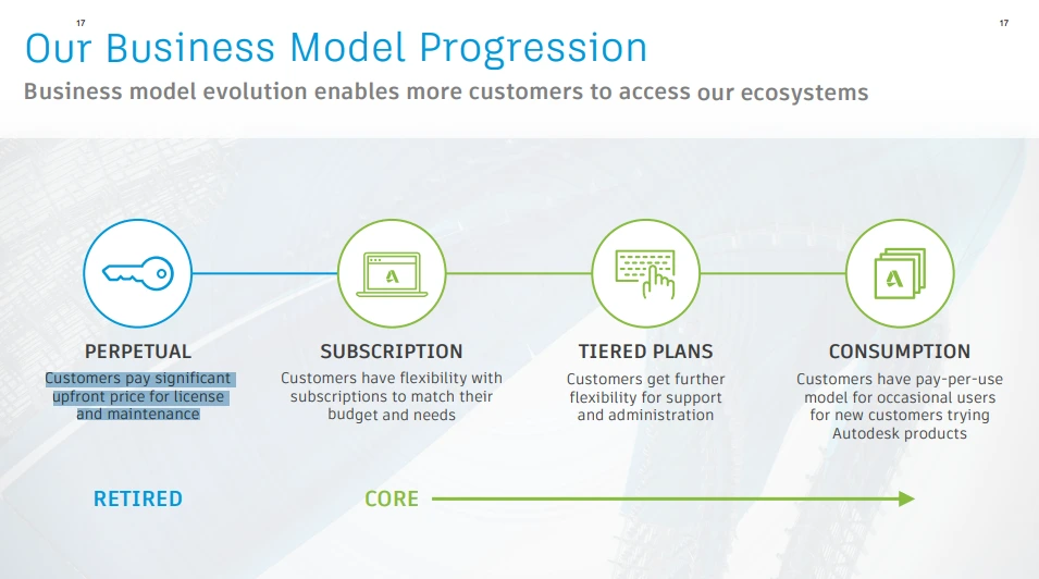 Autodesk는 2016년부터 영구버전 방식을 구독형 방식으로 전환시켜가며 서비스 방식을 변경하고 있었습니다. 그러나 쉽게 넘어가는 것은 쉽지 않았기에 기존 대형고객사에게 다음과 같이 판매되었습니다.