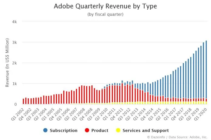 Adobe는 구독모델로 바꾸며 폭발적인 성장을 이뤄냈습니다.