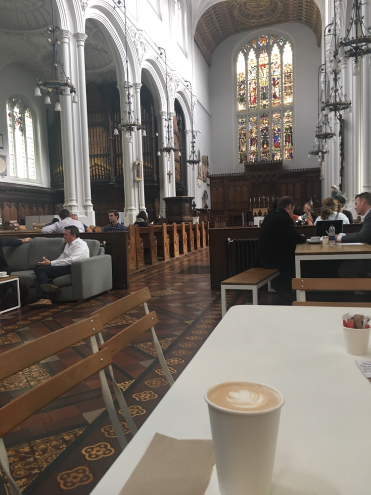 유럽 내 기독교의 지속적인 하락세에 대처하는 지혜인 걸까. 교회 안 의자들을 그대로 두고 거기에 앉아 담소를 나누는 회사원들도 보이고, 한 구석에선 기도를 하는 사람들도 보인다.
