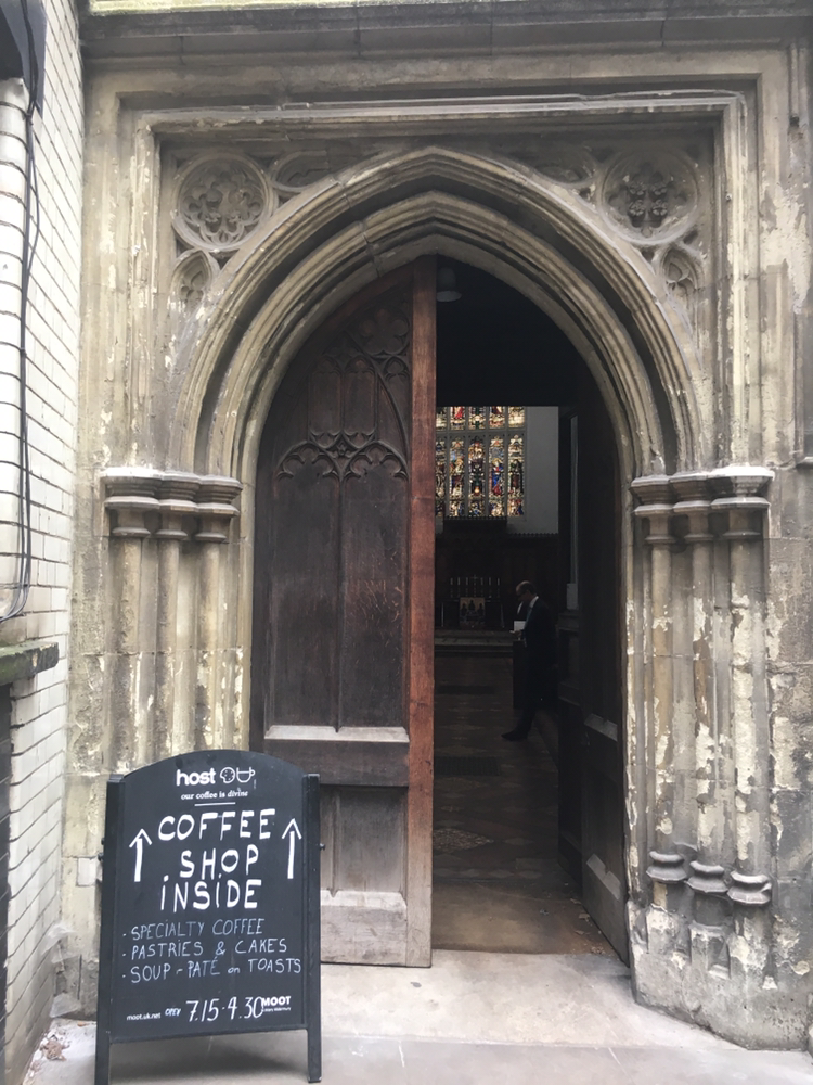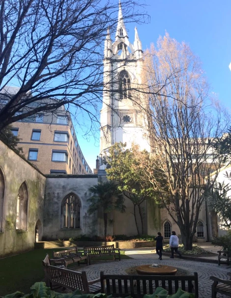 도심의 빌딩 숲 속에 있는 오래된 성공회 교회인데 2차 세계대전 당시 나치의 런던 대공습 the Blitz으로 인해 첨탑을 제외한 교회의 대부분이 훼손되었다고 한다.
