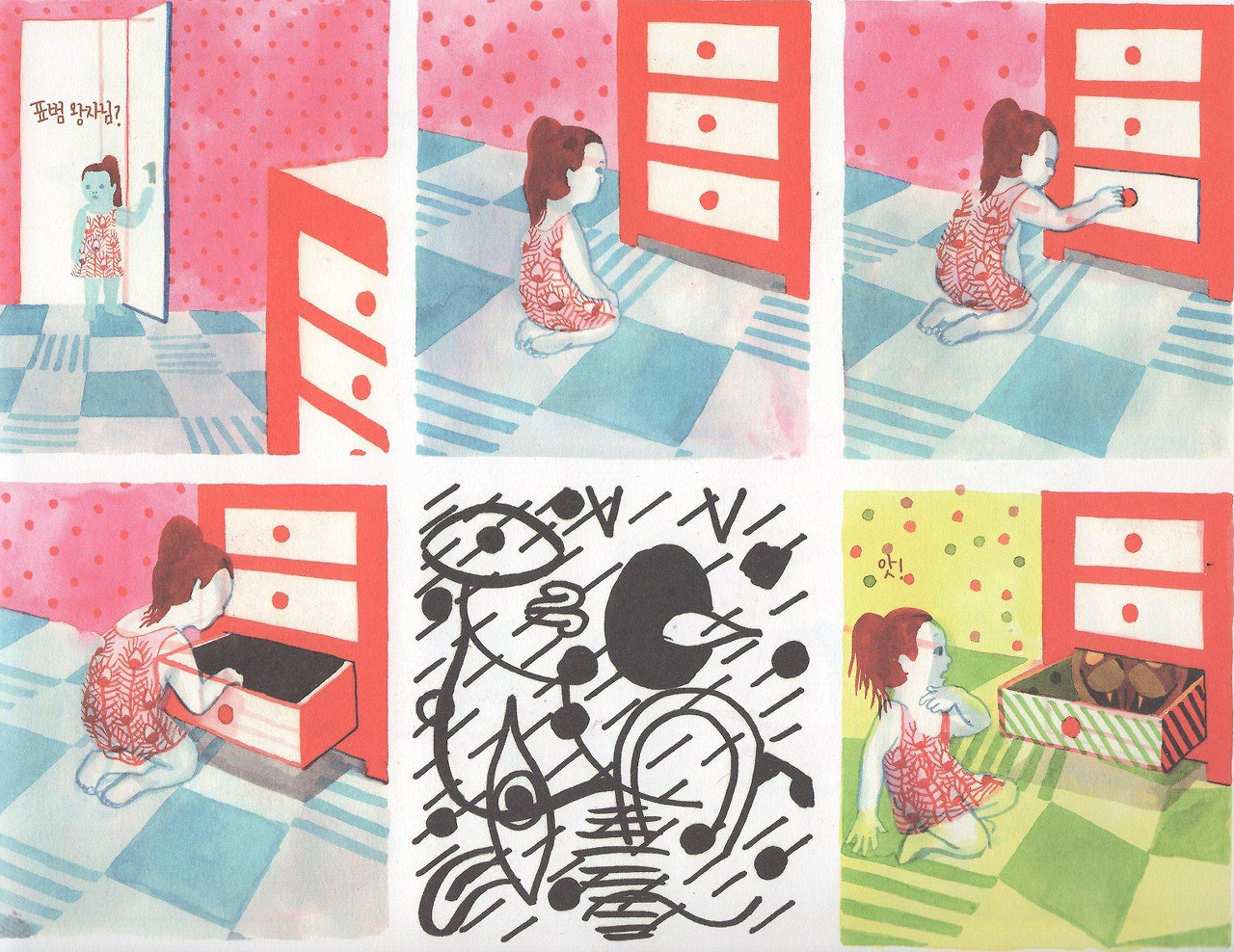 아이를 집어삼키는 어둠 다시 말해 표범의 정체는 무엇일까? 우선 아이의 방과 표범의 고향 팬더랜드를 이어주는 ‘서랍장’을 주목해 보자. 아이가 서랍장을 열 때 그 안에는 표범의 형태를 구성하는 검은 기호가 어지러이 엉켜 있다.