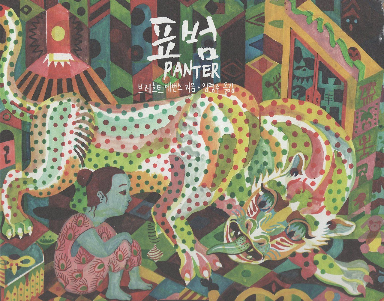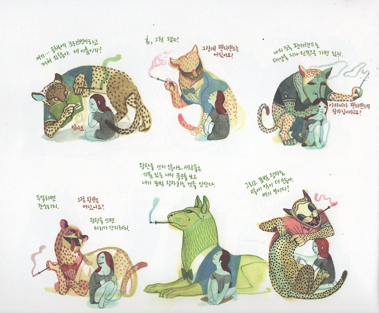 <표범>은 동화책에서 영감을 받아 만든 작품이다. 옆으로 긴 책 판형은 동화책을 연상시키며, 무엇보다 미지의 세계를 안내하는 동물 또는 괴물 캐릭터는 동화의 전형적인 이야기 구조다. 하지만 여기서 작가는 기존의 동화 서사를 비튼다. 주인공에게 우호적이어야 할 괴물 캐릭터가 위협적인 존재가 되며 결국 이야기의 결말을 잔혹하게 마무리 한다.