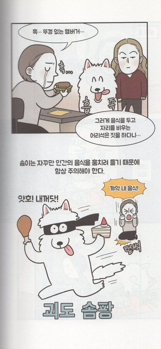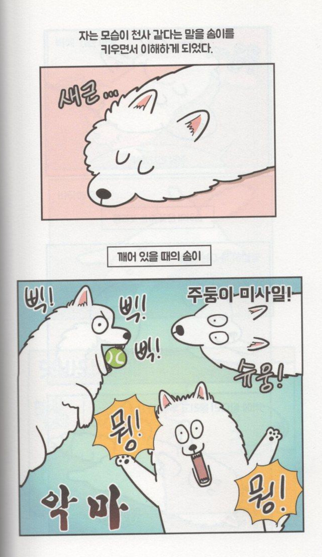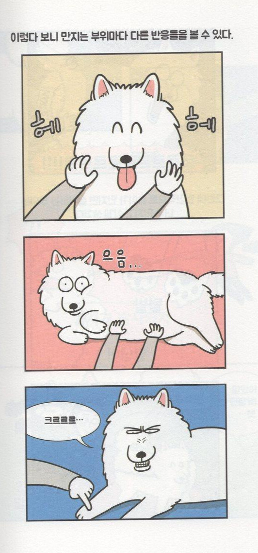 따라서 <극한견주> 솜이 캐릭터는 작가가 키우는 개의 단순한 재현이 아니다. 카툰화를 거친 솜이는 감정과 행동이 기호화된 개의 원형이기도 하다. 커다란 침을 뚝뚝 흘리고, 여러 개의 다리를 미친듯이 퍼덕거리는 봄이의 모습은 개를 키우지 않은 사람에게도 너무나 익숙한 장면이다. 결국 <극한 견주>에서 즐거움을 느끼는 이유는 실제 존재하는 사모예드 봄이의 개성뿐만 아니라 누구나 상상할 수 있는 보편적인 개의 모습까지 함께 볼 수 있기 때문이다.