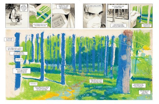 하지만 보다 근원적으로 나를 사로잡는 건 다음과 같은 질문이다. 첫 번째 질문, <체르노빌의 봄>의 세계에서 이 풍경은 그림일까 아니면 현실일까. 작가가 그린 그림이 보이고 다음으로 그 그림이 제시됐을 때 그것은 그림일 것이다. 하지만 두 번째 질문, 그림이 놓인 공간이 칸의 흐름상 세계의 풍경을 재현할 공간이라면. 유감스럽게도 두 가지 가능성 중 어느 것이 옳은지 확신할 순 없다. 이 모호한 풍경은 세계의 모사일 수도 아니면 세계의 현실일 수도 있다. 그 결과 <체르노빌의 봄>은 때때로 우리를 초현실적 세계로 인도한다. 그림과 현실의 경계는 불분명해지며 더욱이 칸의 의미체계마저 흐려질 경우 페이지는 무수한 칸으로 구성된 색채의 패턴으로 분해된다.