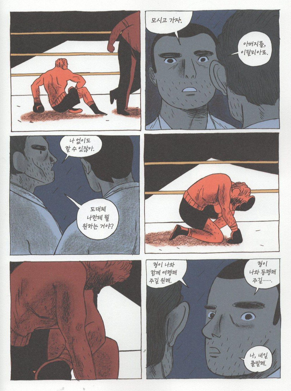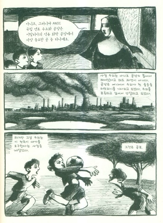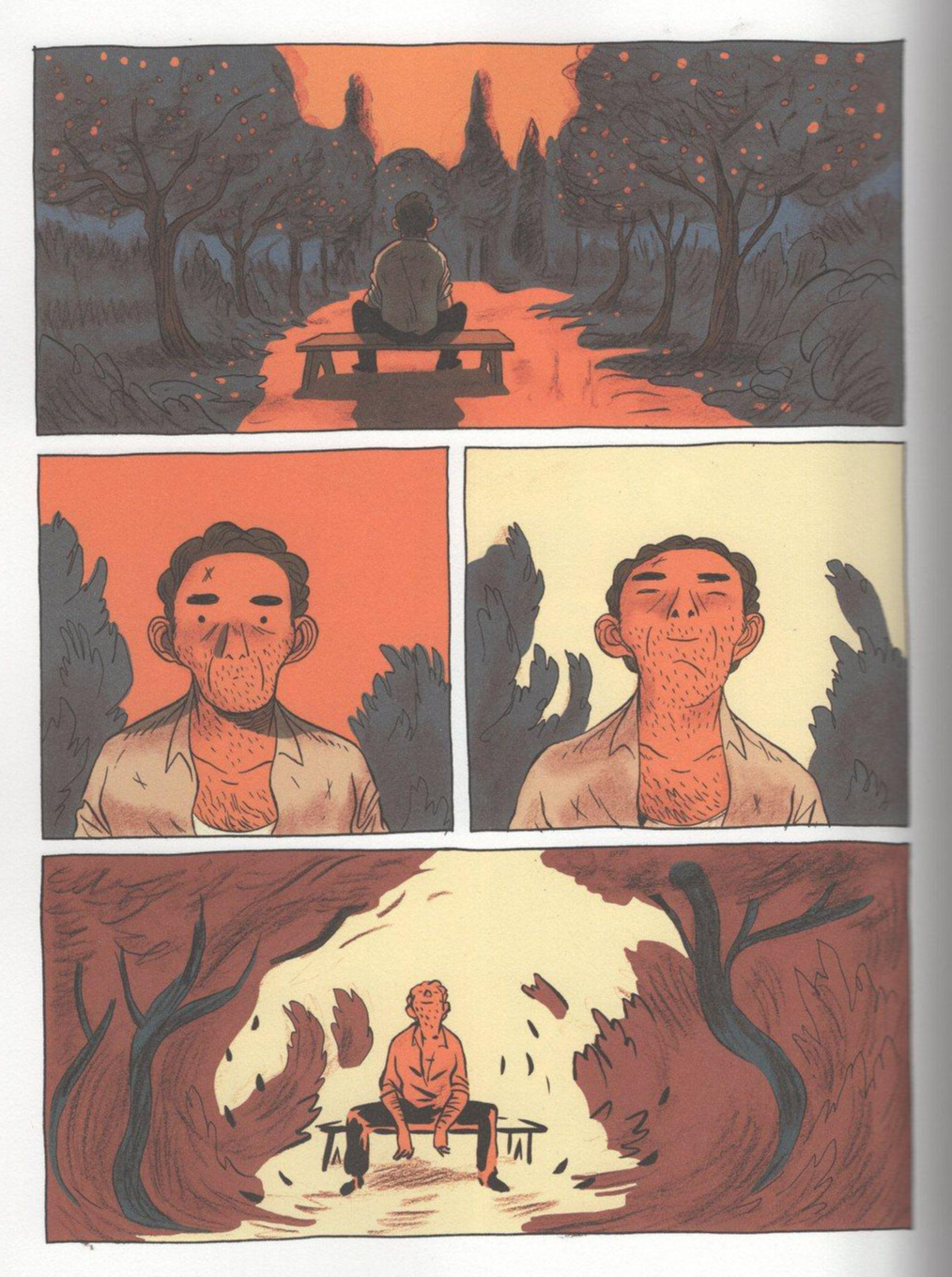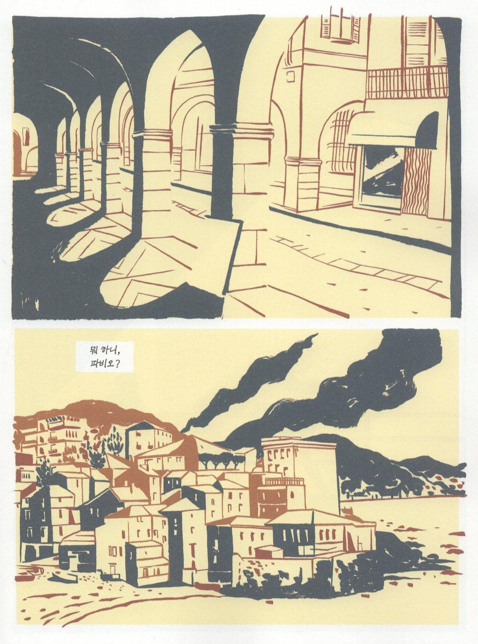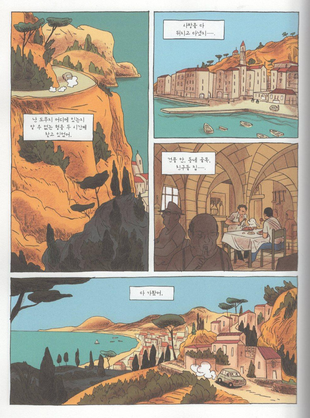 무엇보다 과거를 채색하던 노란색이 현실 세계를 넘어 눈부시게 진동한다. 들판을 가득 매운 노란색 물결, 하늘을 발갛게 물들여 가는 붉은색 노을, 그리고 후각을 마비시킬 만큼 아찔하게 내뿜는 오렌지 향기. 고향의 풍토가 자아내는 이 넉넉함이 아니고선 주인공의 그 평온한 표정을 달리 어떻게 설명할 수 있을까? 주인공 파비오는 지평선 너머를 하염없이 바라본다. 그의 드로잉 선은 목판화의 선으로 변화하고 현재와 과거는 마침내 예전처럼 하나가 된다.