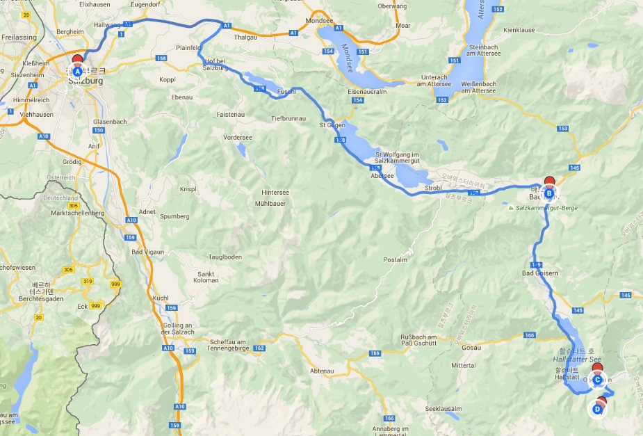 A. Salzburg Hauptbanhnhof(잘츠부르크 중앙역 인근 버스터미널) -> B. Bad Ischl Hbf(바트이슐 버스 정류장) -> C. Obertraun(오버트라운) -> Dachstein(다흐슈타인) ->D. 5 Fingers(파이브핑거스)