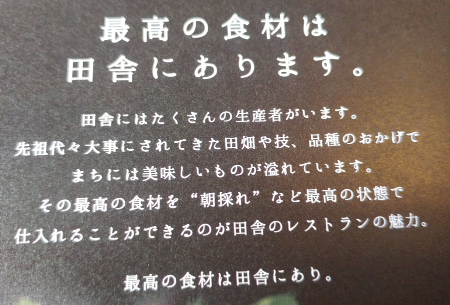 "시골에는 많은 생산자들이 있다. 조상 대대로 선조들이 지켜온 논 밭이랑 기술, 그리고 품종 덕분으로 지역에는 맛있는 것들이 넘쳐 난다. 최고의 식재료를 아침에 수확해서 최고의 상태로 들여올 수 있는 것이 시골 레스토랑의 매력이다"