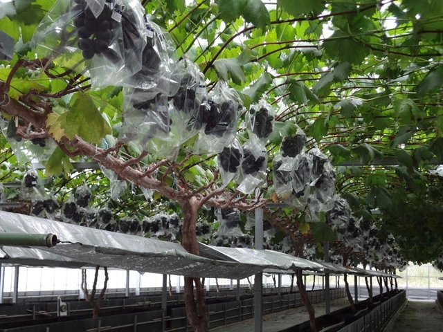 ‘미야타 패밀리 포도원’의 농지는 현재 5ha. 인수한 관광농원에는 베리 A, 고르비 등의 품종도 있지만 기본적으로는 거봉이다. 먹는 순간 왕이 된 기분이 들 정도의 최고급 포도라는 것을 표현한 브랜드 ‘임금님 포도’ 화학 비료는 일체 쓰지 않고 쇠똥 퇴비, 깻묵, 어분, 콩 퇴비, 쌀겨 등 유기질 비료만 사용하여 토양을 가꾼다. 병충해 방제에 있어서는 농약의 농도나 횟수를 줄임으로써 맛있고 안전한 포도 재배에 진력을 다하고 있다.