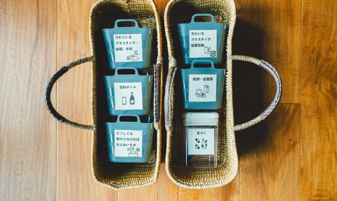 쓰레기통 대신 놓인 바구니가 실제로 어떻게 생겼는지, 각 칸에 붙은 라벨(종이/비닐/플라스틱 등)은 얼마나 직관적인지 촬영.