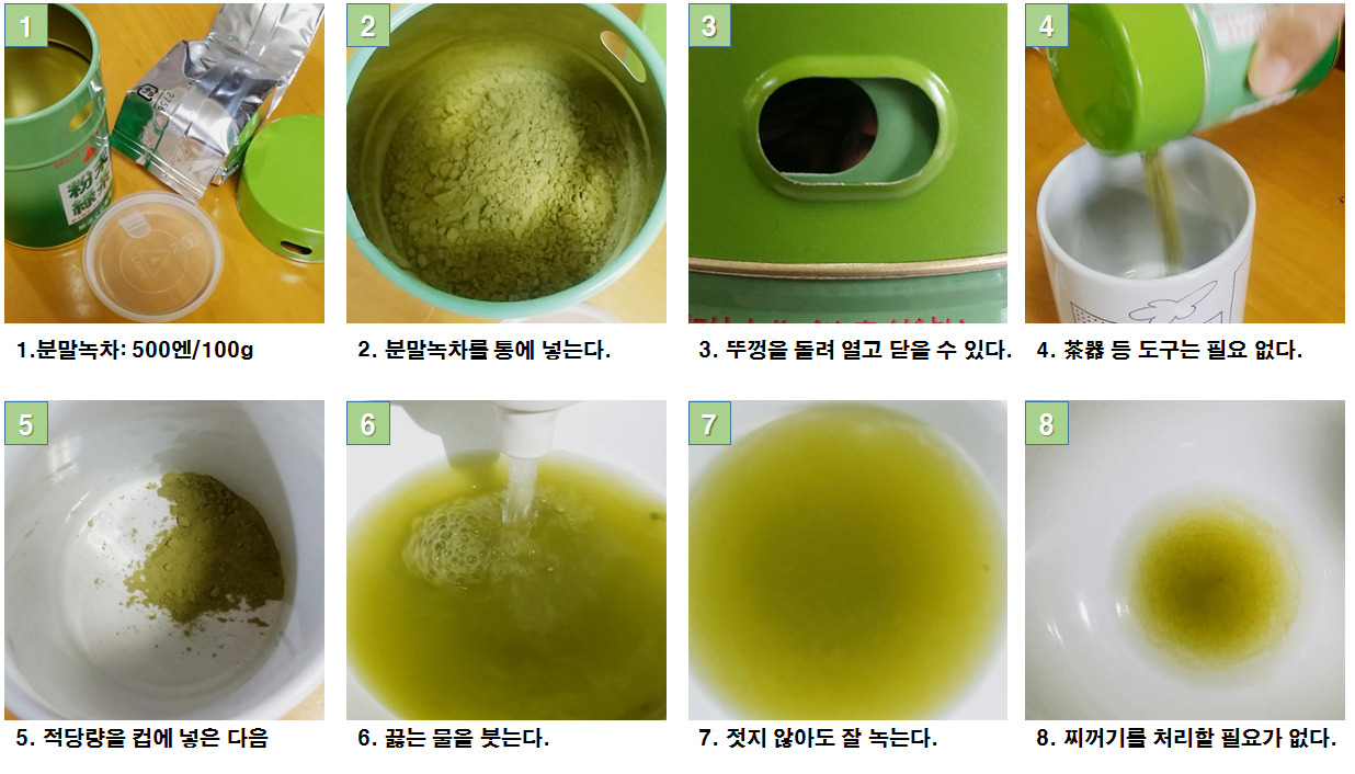 분말녹차는 더운물과 컵만 있으면 끝이다. 끓는 물을 식히지 않고 넣어도 쓰지 않다. 맛있다. 찌꺼기도 남지 않는다. 젓지 않아도 충분히 잘 녹는다. 아이들도 잘 마신다. 게다가 대중적 가격이다.