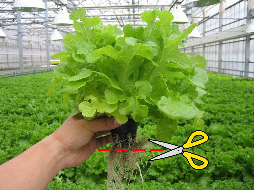 ○ 생육이 완성된 상추를 수경 포트에서 꺼내 가위로 뿌리의 지저분한 밑동을 잘라낸다.