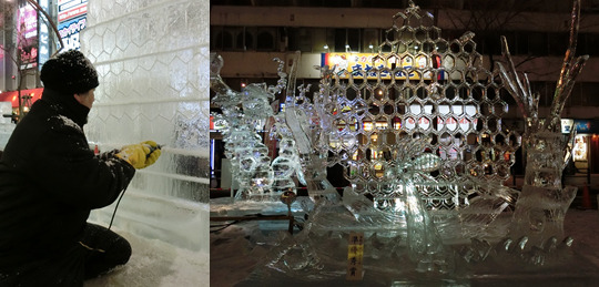 홋카이도의 특산물인 털게와 갑오징어, 연어를 얼음 속에 넣어 만든 조각 등 다양한 작품들이 선보인다.