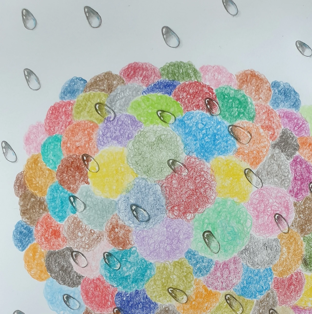 그림을 그리고 싶은 마음이 생기지 않으면 그림을 잠시 쉬어야 하는 것을 기어코 그려 보겠다며 엉덩이 딱 붙이고 앉아 손 가는 대로, 마음 가는 대로 색연필 골라가며 드로잉 겸 색칠. . 그리면서도, 그려 놓고서도 맘에 들지 않는다. 비장의 무기(?) 물방울을 얹어 본다. 맘처럼 물방울도 잘 그려지지 않는다. . 역시 이런 날은 그리지 말았어야 했을까? 그래도 그렸음에 나를 칭찬해 줘야 하는 걸까? 찝찝하지만 칭찬해 주는 걸로 마무리 짓는다... ^^