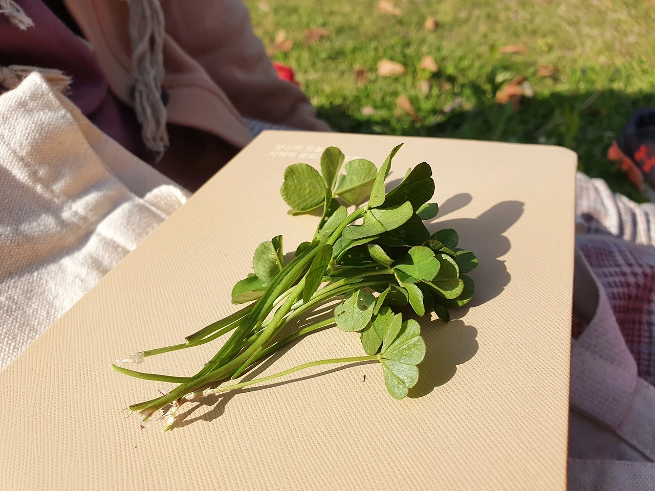 "난 진짜 네 잎 클로버 못 찾겠던데 어떤 사람은 참 잘 찾더라." 그 어떤 사람이 나다. 그냥 걷다가도 찾는다. ^^ . 수많은 세 잎 클로버(꽃말:행복) 사이에 꼭꼭 숨어있는 하나의 네 잎 클로버(꽃말:행운)를 찾으면... 왠지 하나의 찾은 행운이 수많은 행복을 가져다줄 것 같은 느낌이 든다.^^ . "네가 좋아하는 그림과 네가 잘 찾는 네 잎 클로버를 잘 합치면 멋질 것 같아." . 남편의 조언을 흘러들었는데도 계속 머릿속에서 맴돌았다. 그리고 점점 궁금해졌다. 좋아하는 것 + 잘하는 것은 어떤 결과를 가져올지..^^ . 그래서 오늘 공원에 나가 네 잎 클로버를 한 움큼 찾아서 다이어리에 꽂아 놓았다. 행복을 가져다 줄 행운을 만들어 보려고...^^ 만든 행운들을 많은 사람들과 함께 나눠보려고.^^