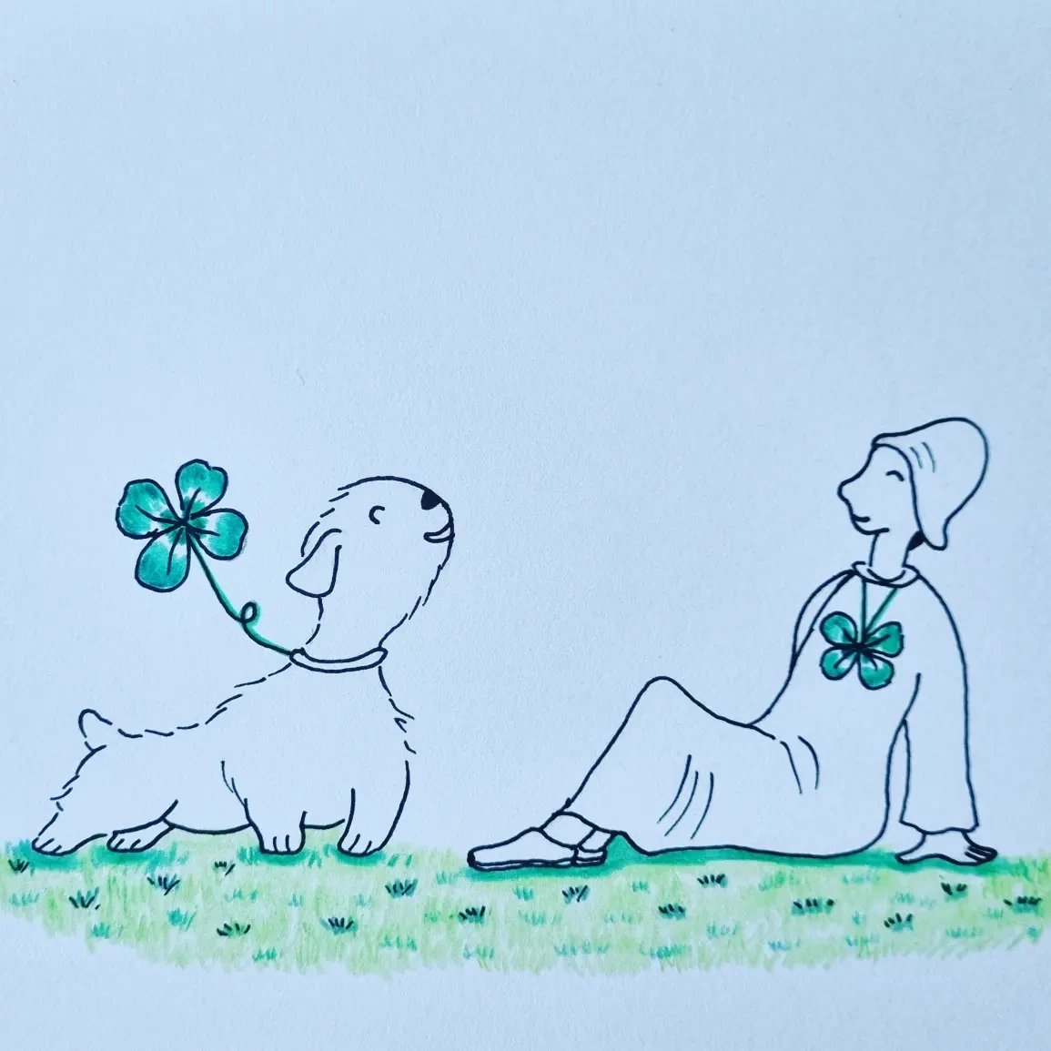 푸른 잔디밭에 쉬고 있는 한 여자가 있다. 그 옆엔 강아지라 하기엔 등치가 큰 개가 산책 나오니 신난다는 듯 이리저리 뛰어다닌다. 왠지 좋은 일이 생길 것 같은 설레는 마음에 미소가 저절로 지어지는 오후다. . 요가 수업시간에 늦어서 서둘러 가고 있을 때 발걸음을 멈추게 한 돌무늬. 일단 사진으로 찍어두고 요가를 다녀왔다. 분명 사진을 찍을 땐 강아지가 연상이 되었었는데 집에 와서 보니 여자 옆모습으로 보였다. . 그리고 무엇보다 바빠서였는지 그땐 무늬 위에 놓인 네 잎클로버를 발견하지 못 했었다. . 아마도 누군가가 네 잎클로버를 찾아서 가던 중 나처럼 어떤 이미지를 떠올렸고 그 이미지 위에 어울리는 위치에 놓아둔 듯하다. 난 강아지 목걸이였을 거라 짐작해 본다. . 떠오르는 두 이미지를 그리는 동안 지어낸 이야기와 지어낸 그림이 뚝딱 완성!!^^ 엉뚱한 상상들을 그림으로 그려내는 작업이 은근히 재밌다.^^ . 큰딸은 나와 방향이 다른 옆모습이 작은 딸은 똥(?)이 떠오른단다. 여러분은 어떤 모습이 떠오르시나요?^^
