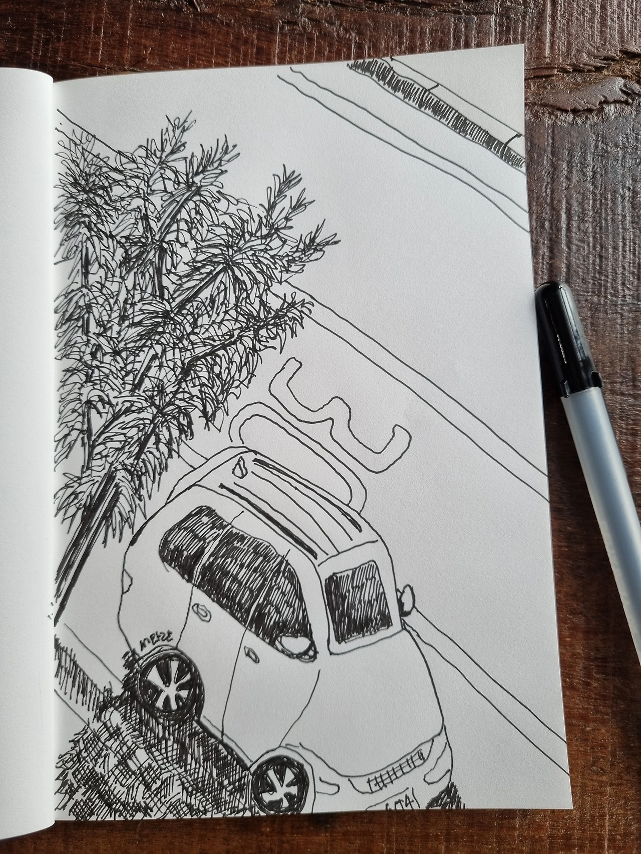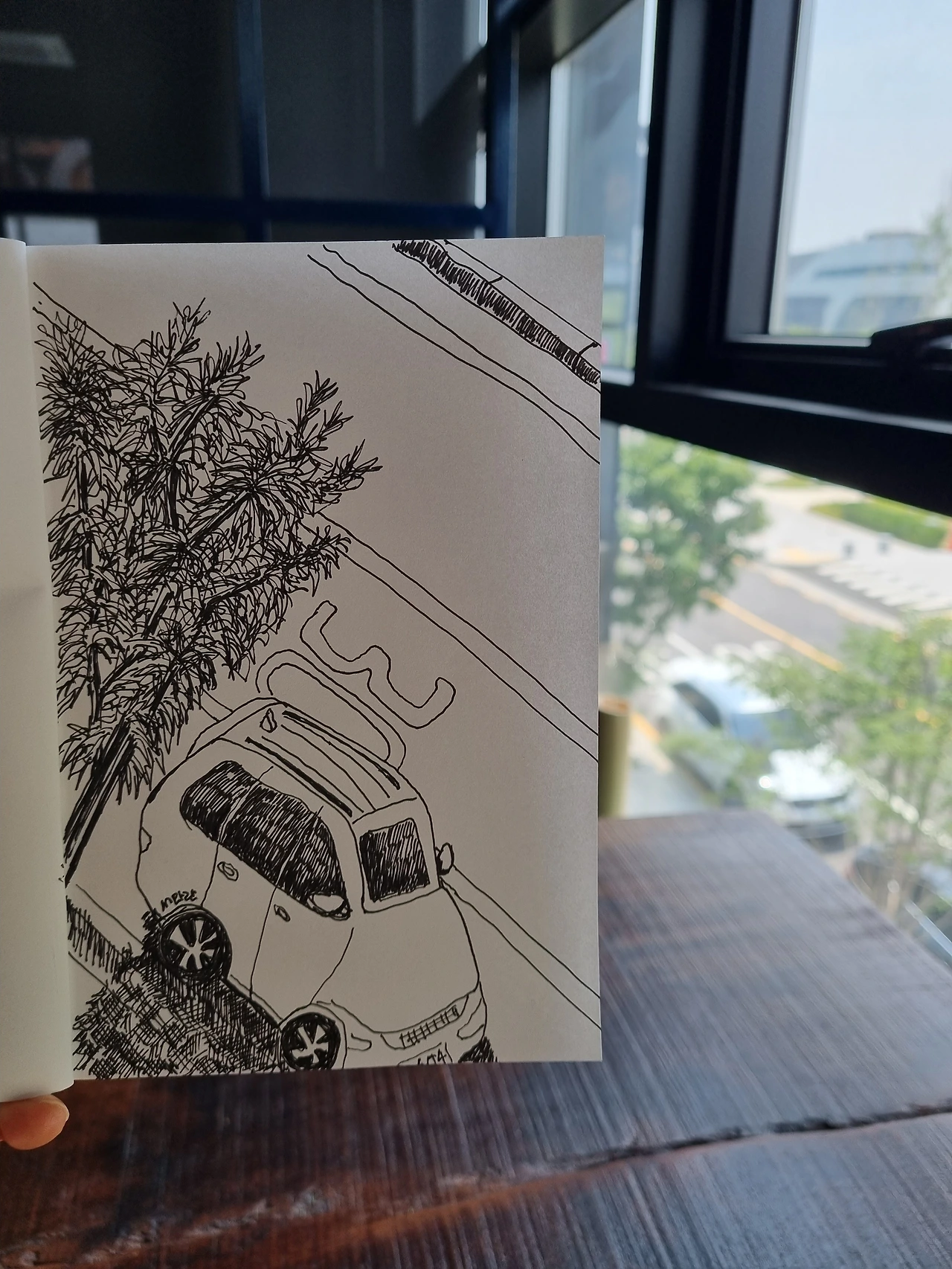 월요일 아침부터 병원을 찾았다. 주말 내내 다리가 아파서 걷질 못해서... 근육통의 일종이란다. . 금요일 요가를 하고, 만보이상 걸었었는데 아마도 무리해서 탈이 난 듯하다. 당분간 요가를 비롯 무리한 운동은 하지 말란다. (운동하지 말라는 말은 쫌 반가운 건 뭐지?ㅋㅋ) . 병원에서 나와 다리 통증도 좀 가라앉힐 겸 카페를 찾았다. 홀로 시간 보내기엔 카페 드로잉이 최고다. . 바깥이 보이는 창가 자리에 앉아 수첩과 펜 하나를 꺼냈다. 오늘은 되도록 사물에서 눈을 떼지 않고 그림을 그려보기로 했다. 역시 엉망진창이지만 새로운 스타일이라 만족 . '다리가 아파도 그림을 그릴 수 있어 좋은데 손이나 눈이 아프면 얼마나 우울할까? 가수들이 목을 관리하듯, 나는 손과 눈을 더 관리해야겠다. 누가 보면 대단한 화가라도 되는 줄 알겠지?' 문득 든 생각에 혼자 미소 지었다. ^^