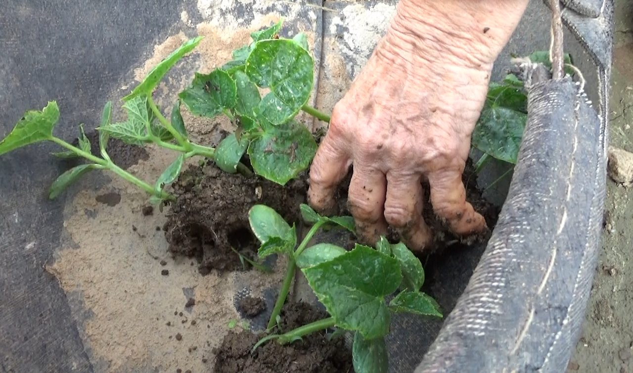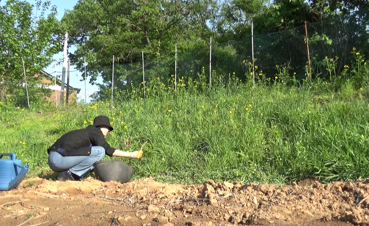 “저기 경사진 데에 심으면 댜. 구멍 파서 물 듬뿍 주구 심어.