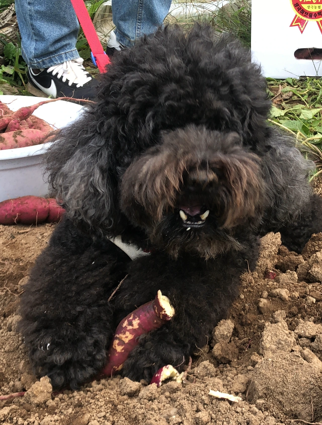 고구마를 캐는 것이 설레는 건 나뿐만이 아니었다. 우리 집 귀염둥이 막내 강아지 록키는 수확 내내 고구마 밭을 계속해서 서성였다. 평소 고구마말랭이 간식을 좋아하는 록키는 어디서 먹어본 냄새가 났는지 캐낸 고구마 중 먹기 좋은 크기를 골라 냉큼 물고 도망간 그 자리에서 바로 뜯어먹었다. 우리 가족 중 가장 먼저 고구마를 맛본 건 록키다. 냠냠 정신없이 먹는 모습을 보니 고구마 맛이 아주 좋다는 것을 알 수 있었다.
