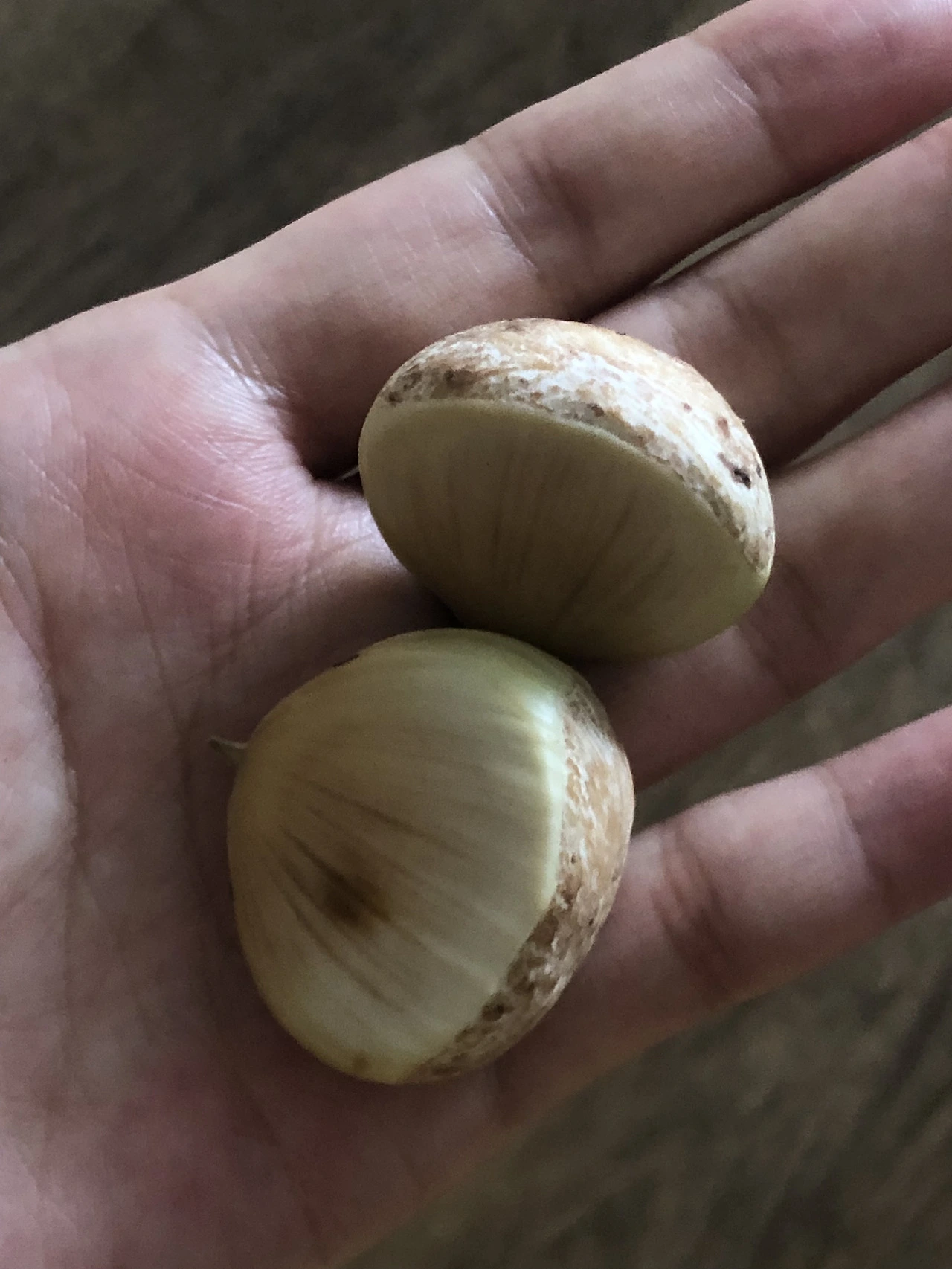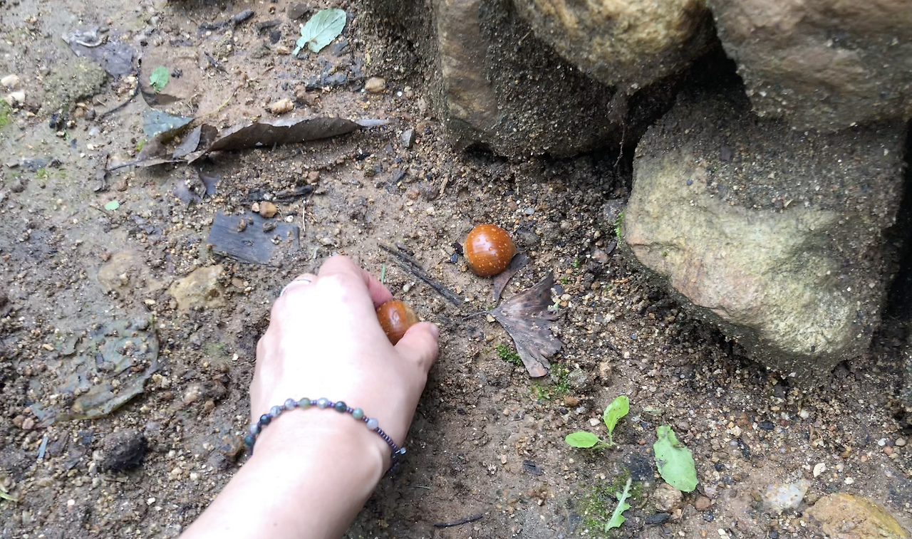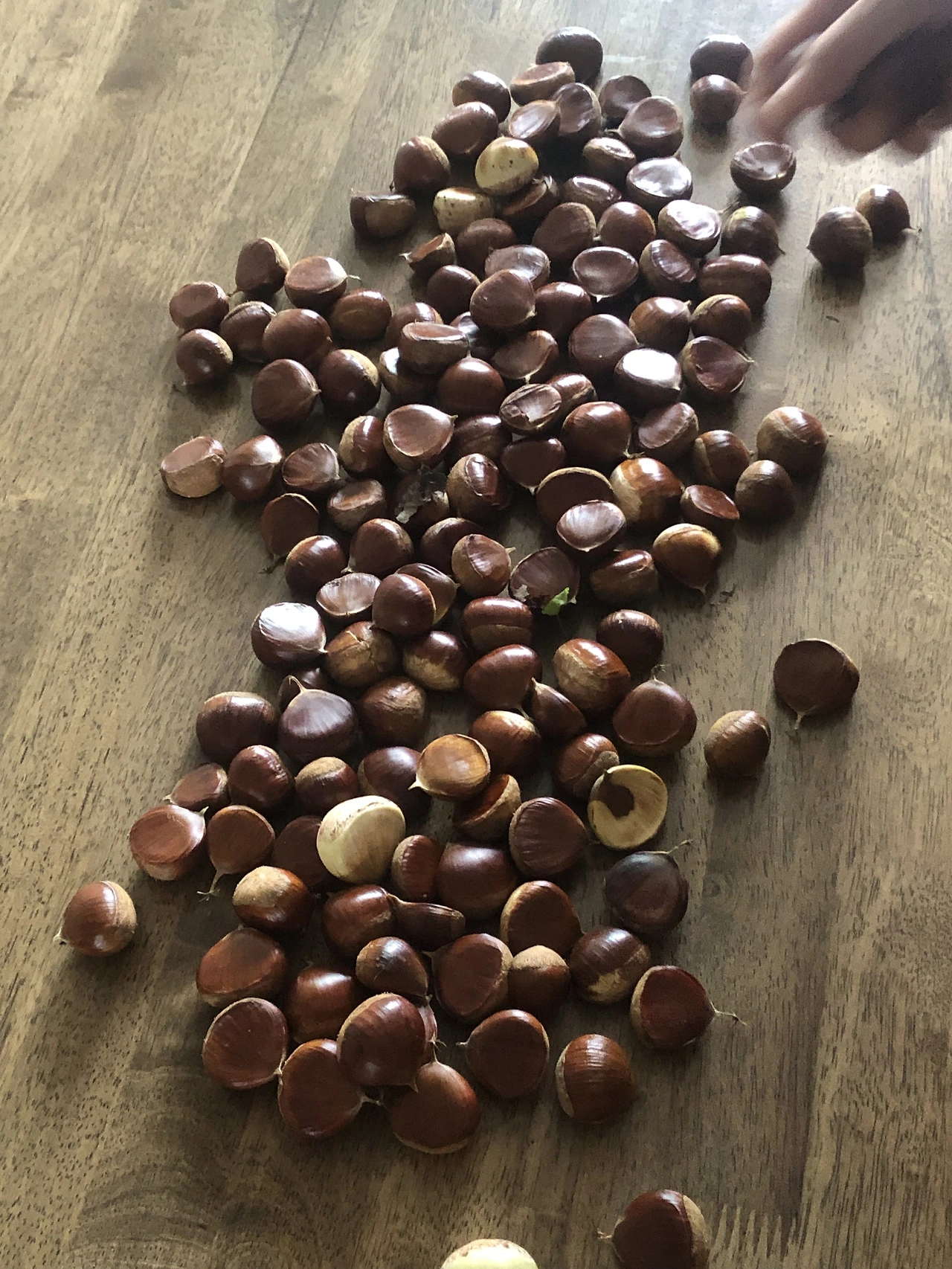 텃밭을 시작함과 동시에 밭일을 하다가 지치면 잠시 쉬어갈 곳을 마련했었다. 우리 가족끼리 캠핑장이라고 부르는 그곳은, 봄에는 때가 되자 살구가 잔뜩 떨어졌다. 그런데 이번엔 밤이다. 허리를 굽혀 땅을 쳐다보며 살구대신 동그란 갈색의 알밤을 줍고 다닌다. 얇은 신발을 신고 가시 돋친 겉껍질을 까자니 너무 따갑다. 이젠 밑창이 단단하고 두꺼운 신발을 신어야겠다.