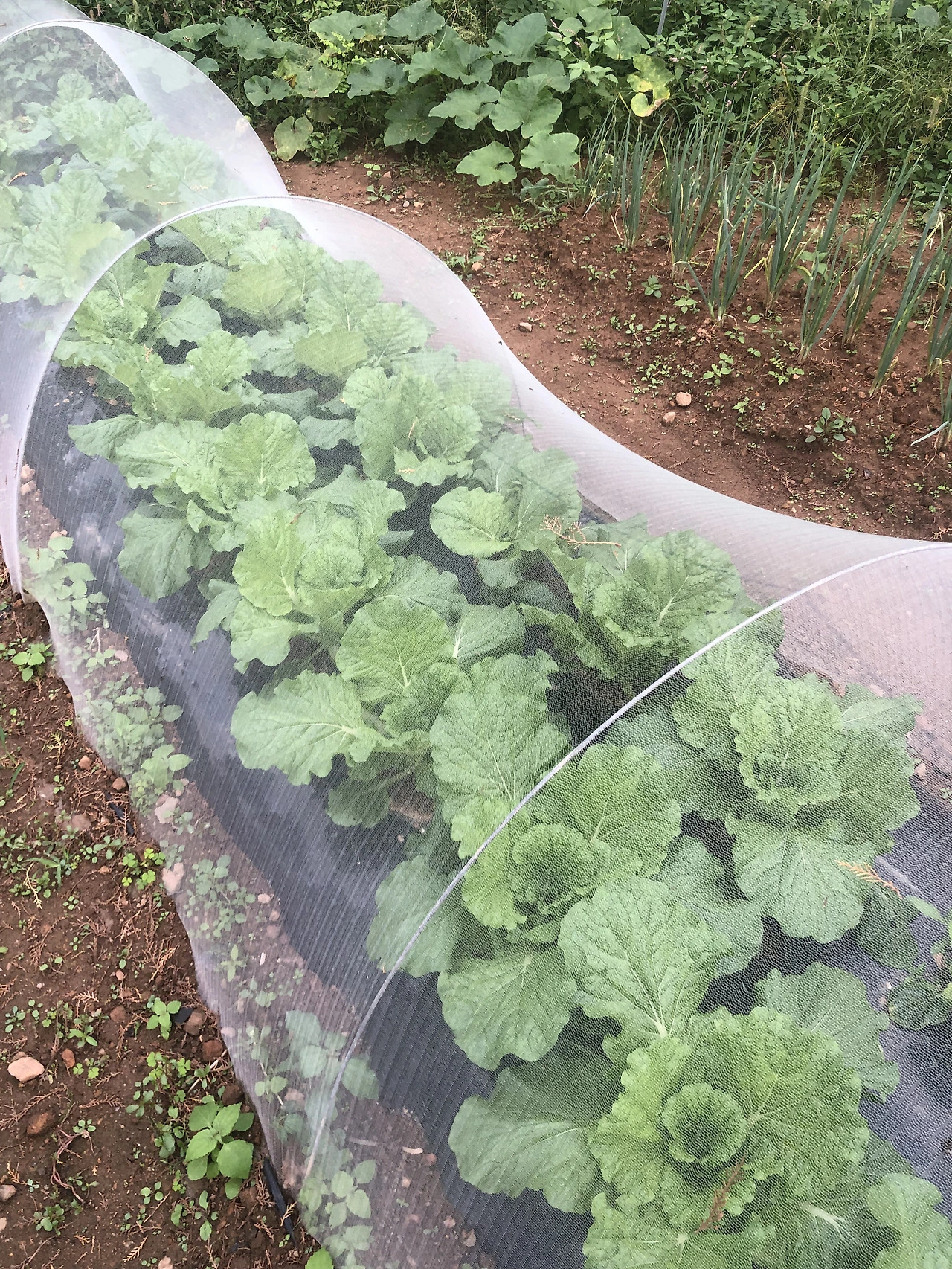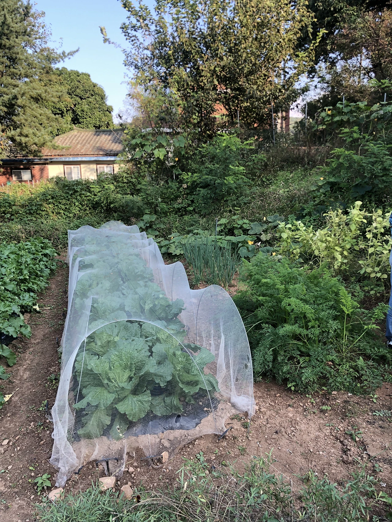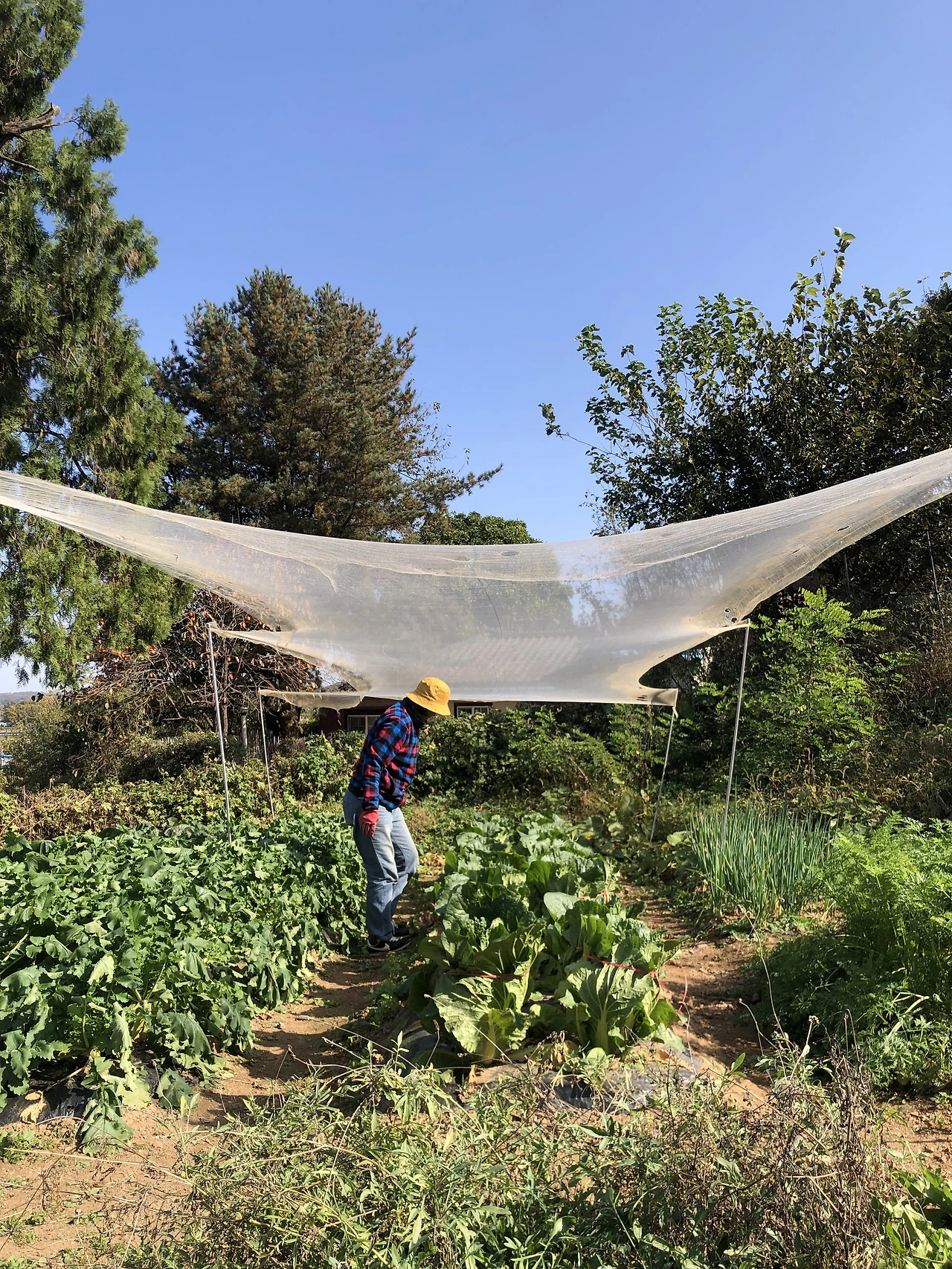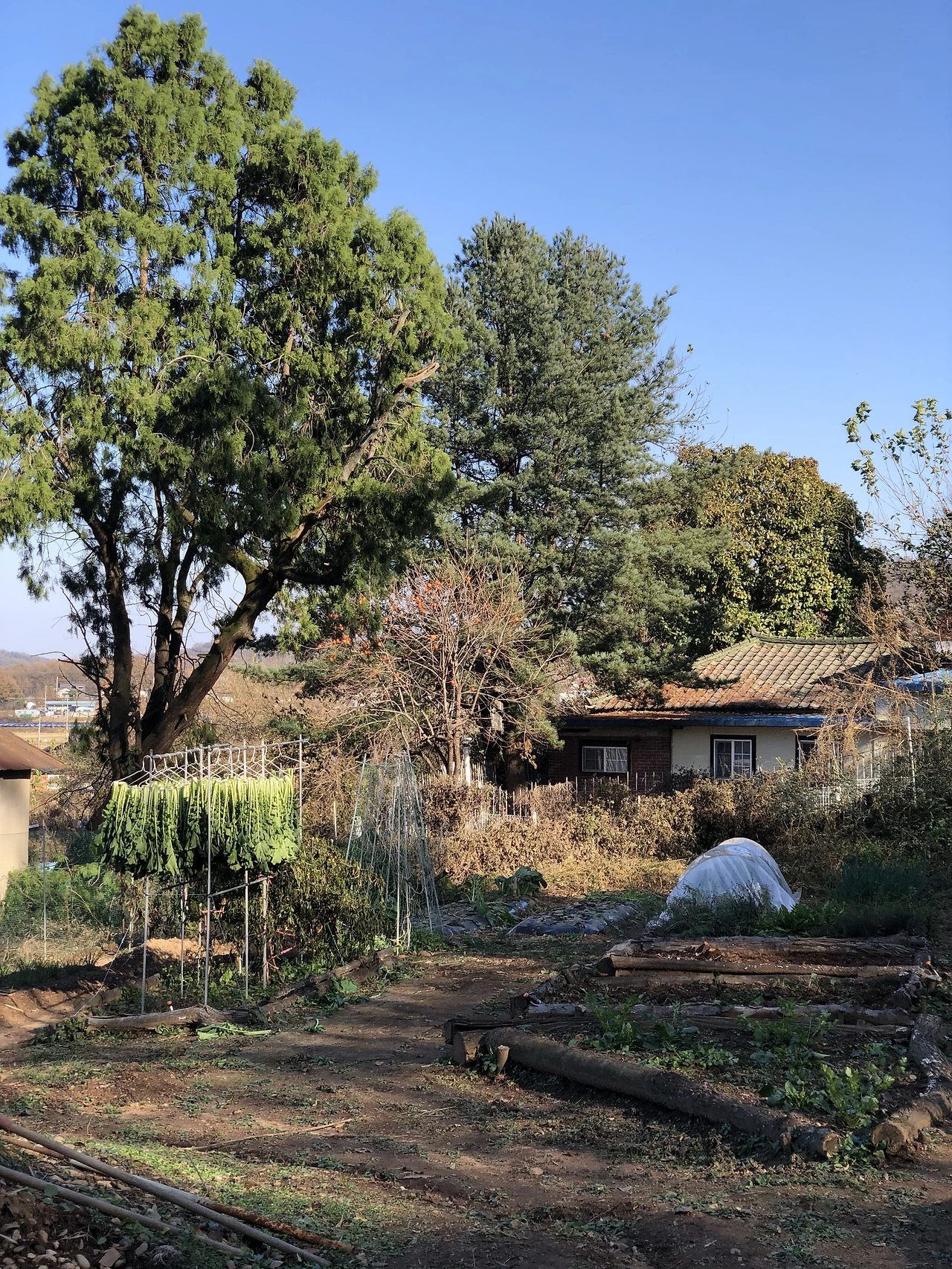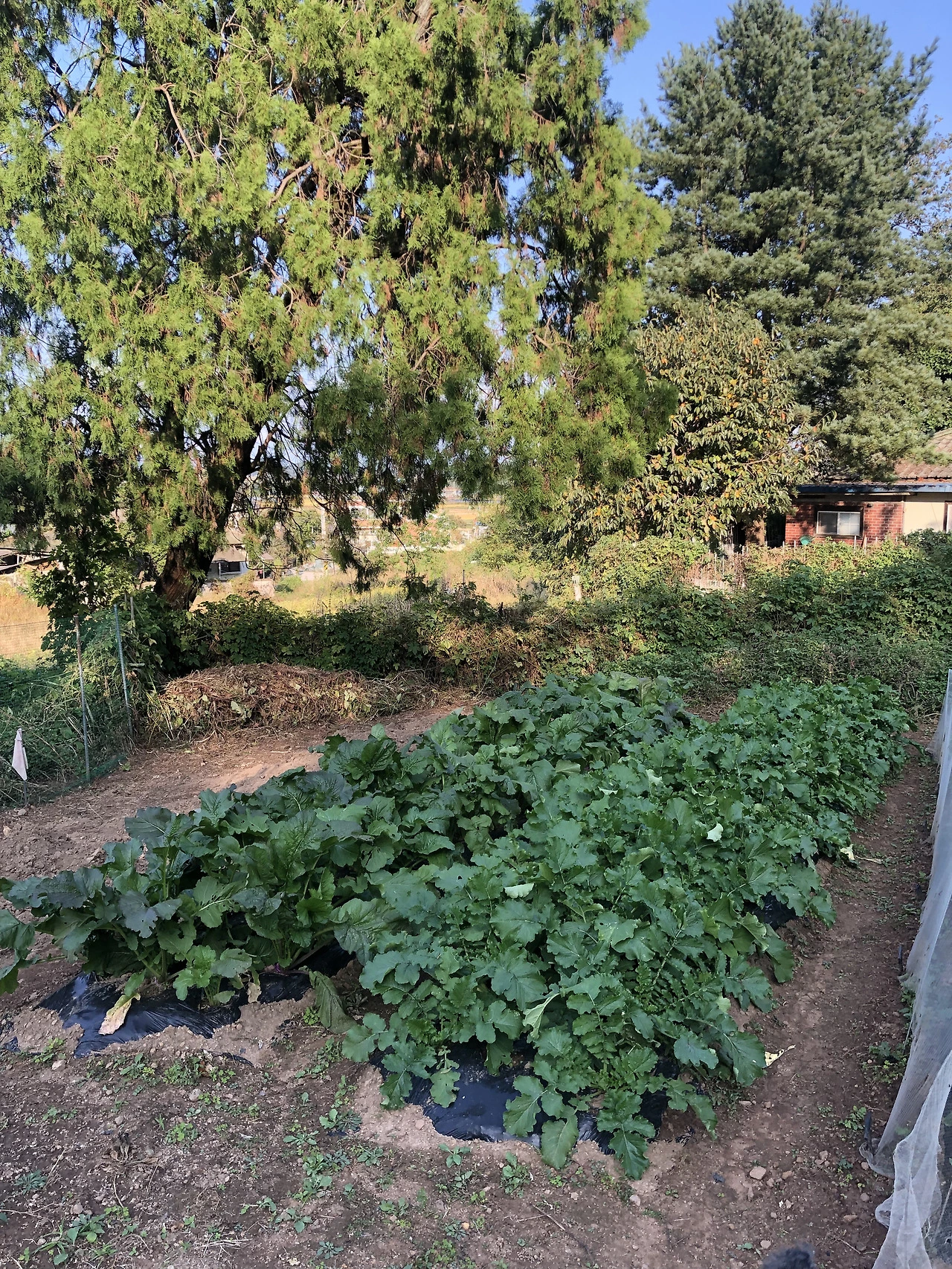 또 배추 밭 주변에는 멋들어지게 자라는 향나무가 하나 있다. 하늘이 예쁜 날엔 향나무 쪽을 한 번 쳐다보며 '이것이 바로 힐링!'이라며 외쳤었다. 그러나 사람은 참 간사하게도 향나무잎 때문에 나무를 향한 나의 시선이 다소 달라졌던 시기가 있다. 배춧잎 사이로 잔뜩 향나무잎이 들어갔기 때문이다. 다행히도 한랭사로 위기를 모면해 멋진 풍경을 지금까지도 간직할 수 있었다.