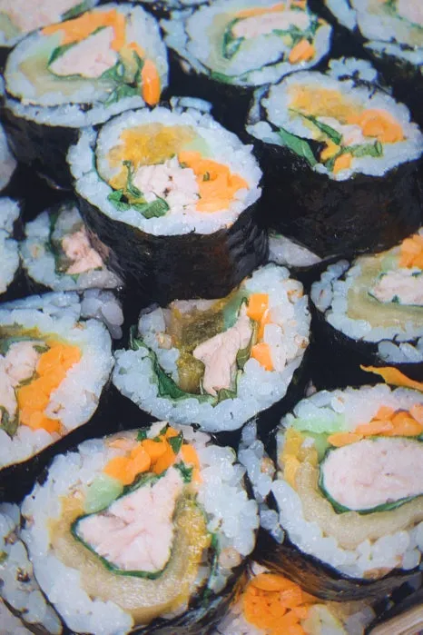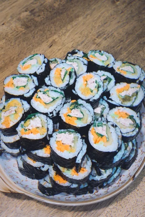 재료 : 김, 밥, 묵은지, 당근, 오이, 깻잎, 참치, 마요네즈