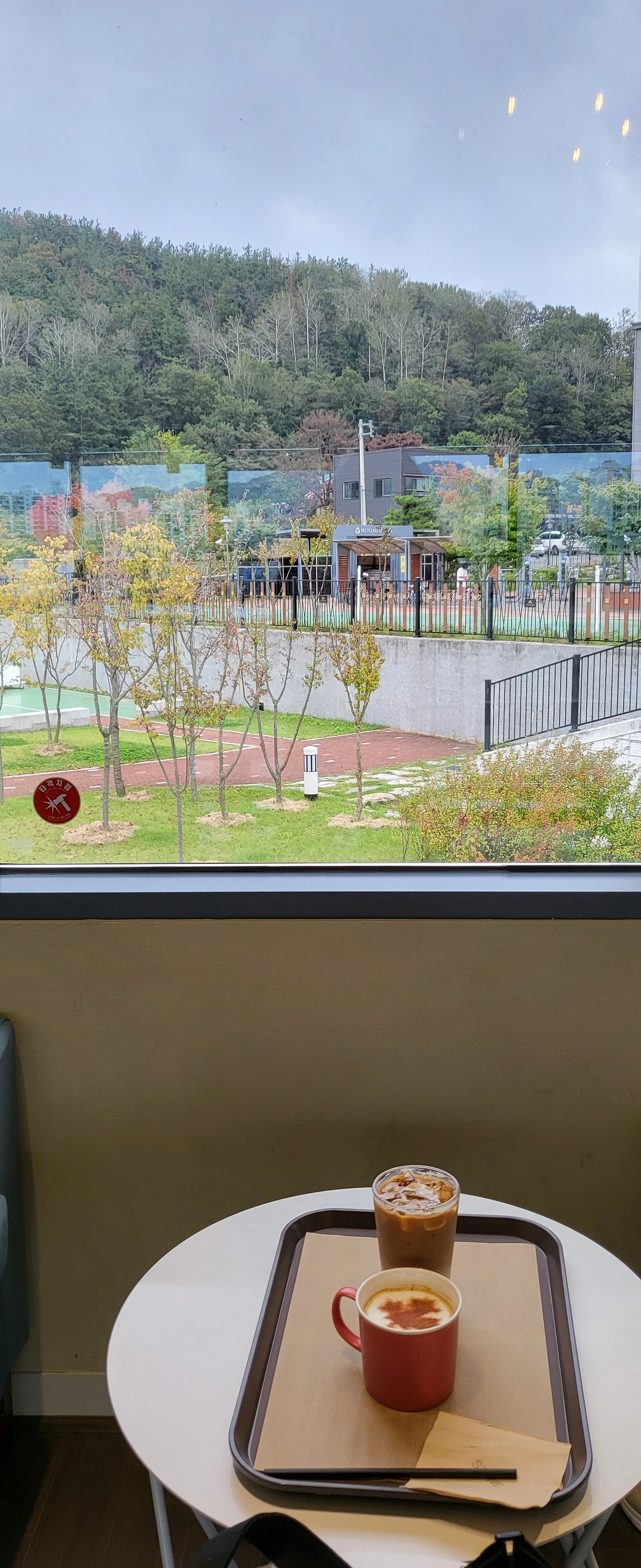 펜스 쪽에 앉았다면 더 좋았겠지만 좌석이 생각보다 작은 카페인데 사람들은 끊임없이 이어져서인지 좋은 명당자리는 이미 매진이 되어 아파트 쪽 자리에 앉았는데도 둘러볼 때마다 시원한 시각적 이미지에 마음이 저절로 편안해짐을 느꼈다.