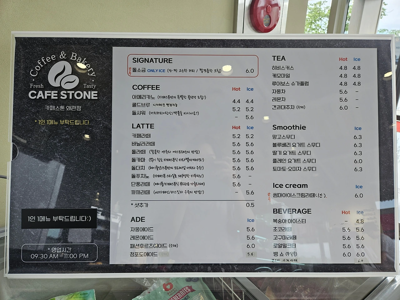1층에는 카운터 바로 앞 출입구와 카운터 우측에도 입구가 있었고 좌석은 좌측, 우측은 마주 보는 형식의 테이블이 카운터 바로 앞에는 창가를 바라보는 좌석이 마련되어 있었고 음료가격도 여느 카페와 비슷하게 구성이 되어 있었다.