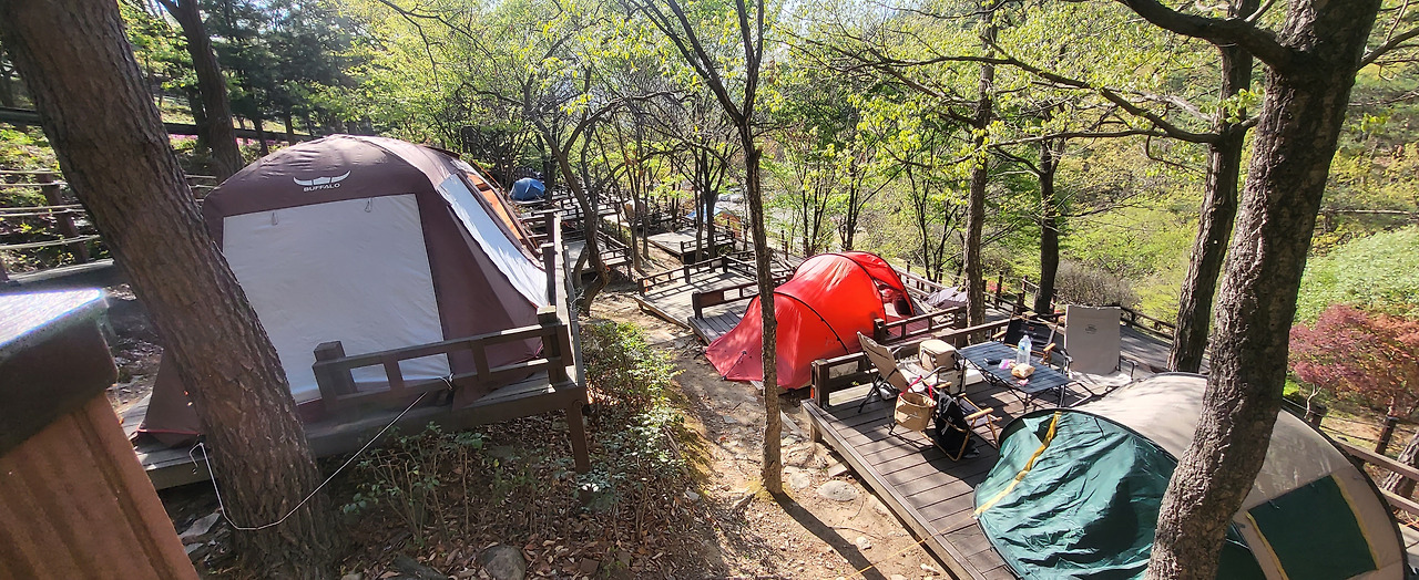 그래도 모기향이랑 에프킬라 정도는 하나씩 챙겨가는 것이 좋으며 1 야영장의 경우 큰 텐트를 설치하기에는 좋지만 문제점은 경사가 가파른 편에 속한다. 자동수레가 있어 힘들이지 않고 끌고 올라갈 수 있지만 짐이 많아질 경우 부담이 생길 수밖에 없으며 화장실이 주차장 옆에 있으므로 화장실을 자주 갈경우 최대한 관리사무소 쪽 아래로 예약하는 것이 편리하다.